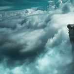 A solitary figure stands on a wind-carved escarpment, looking out over a glowing sea of clouds. Light pours through the sky in soft columns, turning t...[+]