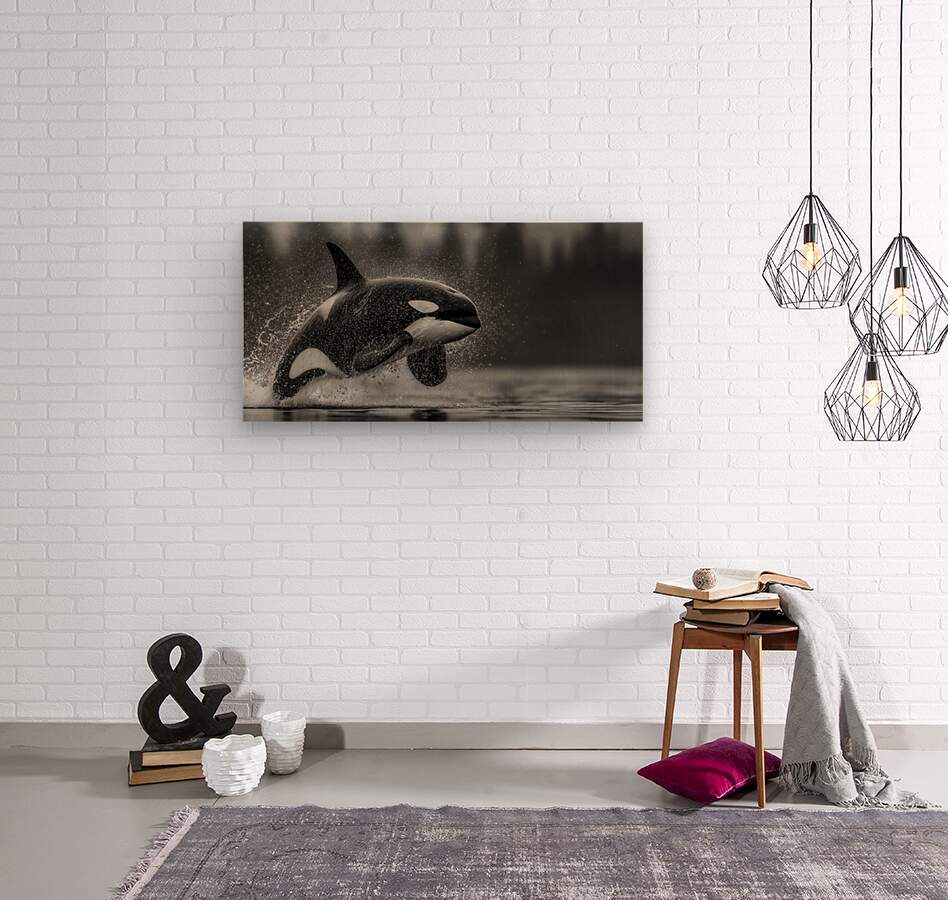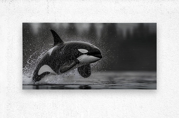 A powerful orca explodes from the water, frozen mid-breach as spray hangs like stars. “Ambush” brings athletic grace and ocean drama to modern spa...[+]