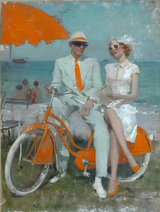 Sunlit pastels, straw hats, and relaxed posture turn a day out into a fashion-forward vignette. Brushy texture keeps the scene human and warm, while t...[+]