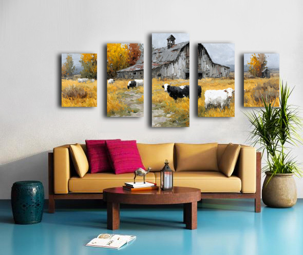 Autumn Barn with Grazing Cows – Farmhouse Landscape Art Print Canvas print