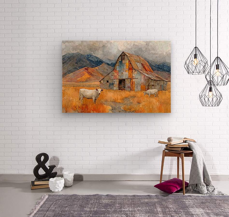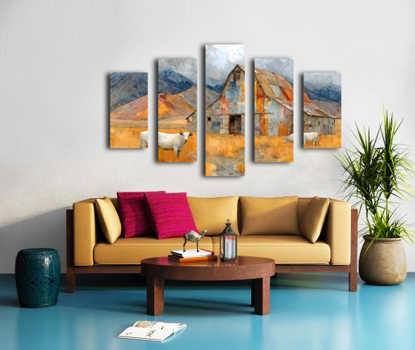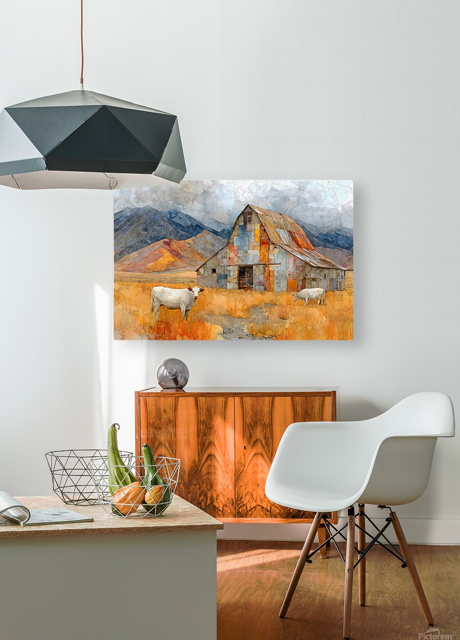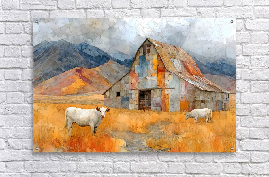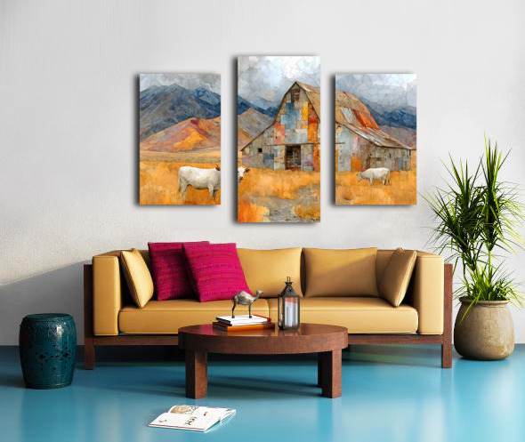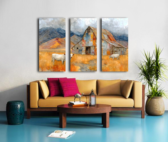 A lively barn scene with patchwork color and two white cows brings warmth and movement to farmhouse décor. The “mosaic” interplay of oranges, blues, and clay tones delivers energy without losing the comfort of a rural subject. It anchors living rooms, dining areas, and entryways while pairing easily with reclaimed wood, woven textures, and matte black accents. Choose canvas for tactile, warm matte surface; HD metal for vivid gloss and crisp geometry; acrylic for a polished, glass-like depth; or framed paper for a classic, low-glare presentation. Printed with archival inks on premium materials and available in custom sizes to hit the ideal scale above a sofa or console. Durable, colorful, and welcoming. Curated by Savage Art Prints.