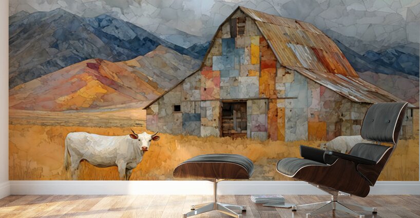 Get this artwork "Mosaic Barn & Two White Cows – Farmhouse Landscape Art Print" in a framed print.