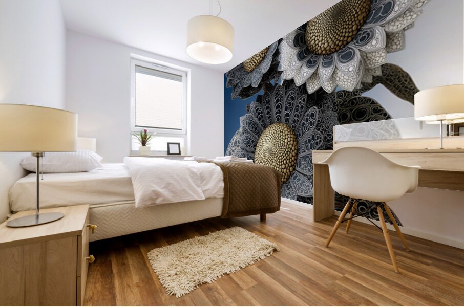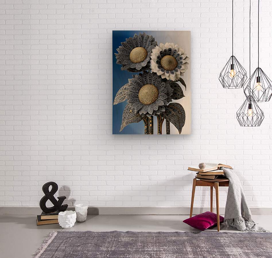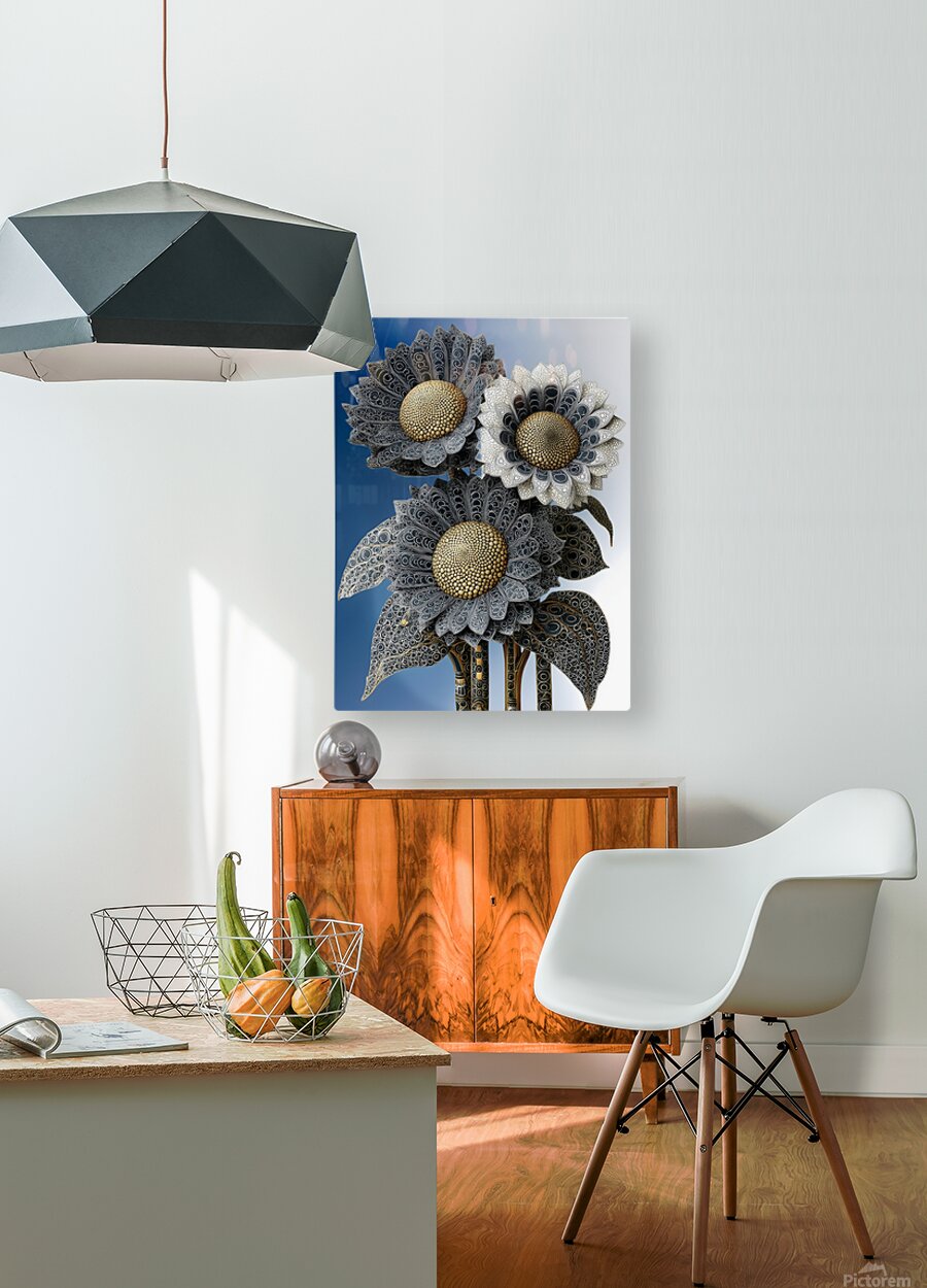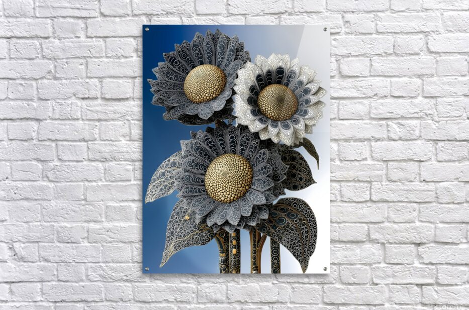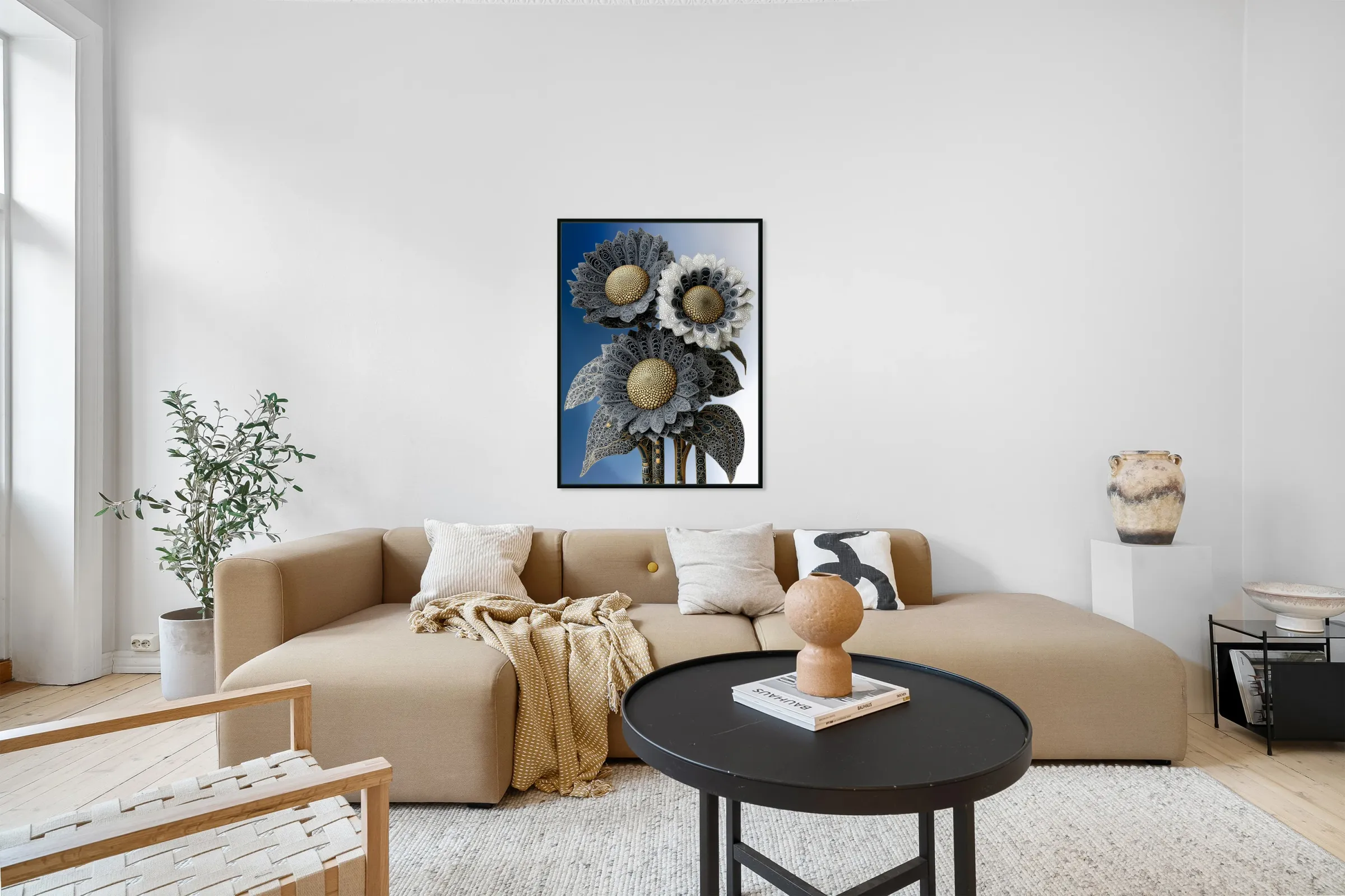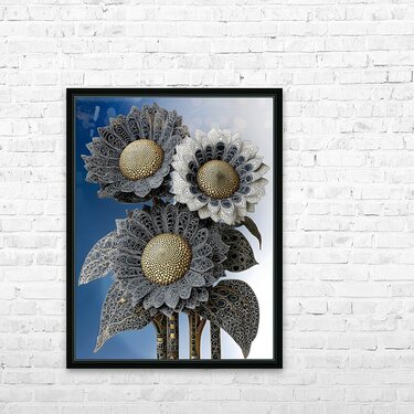 Three sunflowers bloom like jewelry—golden seeds and lavish filigree petals set against a cool blue gradient. The mix of black, ivory, and metallic tones reads refined and sculptural, bringing a tailored botanical vibe to modern or classic rooms. Style it with wood, brass, or matte-black accents for a luxe finish. Choose canvas for velvety matte tactility; HD metal for glossy punch and razor detail; acrylic for glass-clear depth and a floating presence; or framed fine-art paper for a timeless, low-glare look. Printed with archival inks on premium materials in custom sizes, ready to hang or frame. Curated by Savage Art Prints.