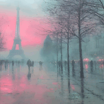 Mist hangs over the Champ de Mars as amber streetlights scatter across rain-slick pavement and the Eiffel Tower glows through the fog. Loose impressio...[+]