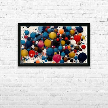 Bubbly orbs drift across a field of color in “Balloon Room,” a pop-bright abstract that instantly lifts the mood. The layered spheres add motion a...[+]