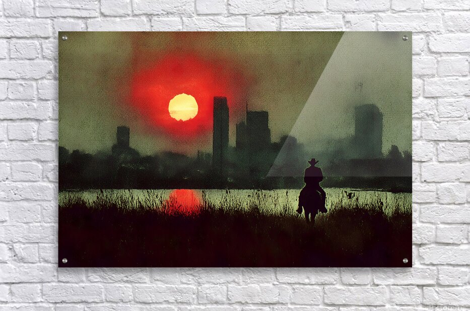 A lone figure in a hat stands against a red-sun skyline, where haze, water, and distant towers dissolve into dusk. The scene is quiet yet cinematic—ideal above a sofa, bed, or long hallway where a panoramic format can breathe. Its restrained palette plays nicely with modern, industrial, or rustic interiors. Select canvas for a soft, matte theater feel; HD metal for high-contrast sheen; acrylic for glass-clear depth; or framed fine-art paper for a refined, low-glare presentation. Archival inks and museum-grade substrates ensure lasting color. Custom sizes available. Curated by Savage Art Prints.