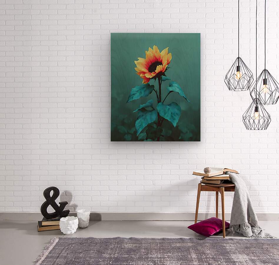 Teal Garden Sunflower – Moody Botanical Art Print  Wood print
