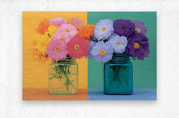 “Sunny Duo” sets two bright jars of blossoms against a creamy peach-to-teal backdrop for a fresh, modern cottage feel. The pastel gradients and ca...[+]