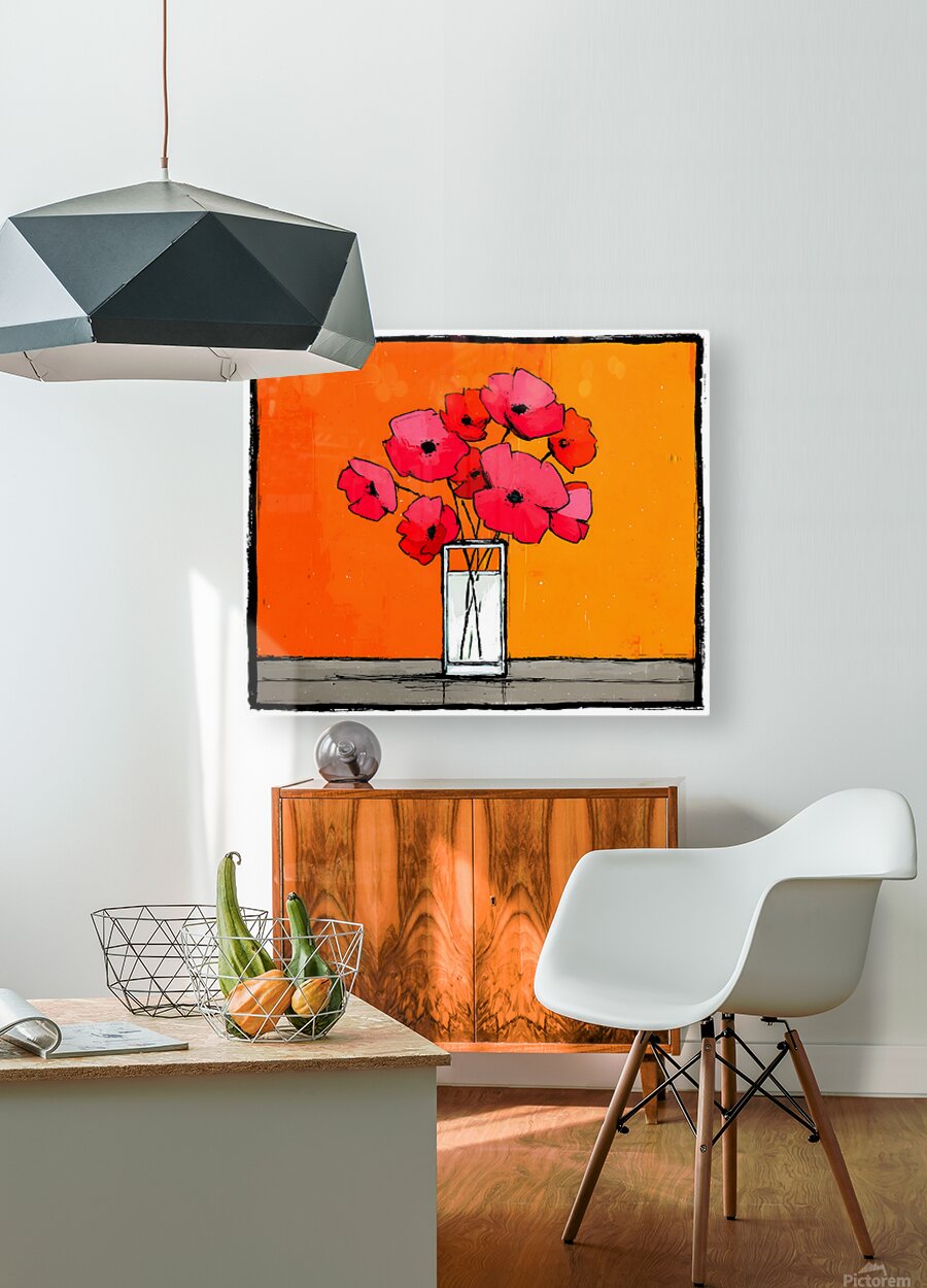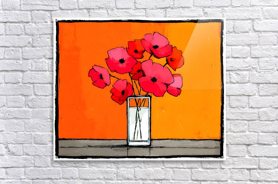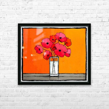 Poppies Against the Fire glows with unapologetic intensity. Scarlet blooms rise from a simple glass vase, backed by a blazing orange field that radiates warmth and defiance. A modern minimal masterpiece that feels both vintage and electric — perfect for bold interiors craving color and contrast. Curated by Savage Art Prints.