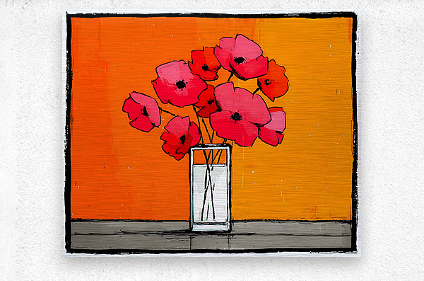 Poppies Against the Fire glows with unapologetic intensity. Scarlet blooms rise from a simple glass vase, backed by a blazing orange field that radiat...[+]
