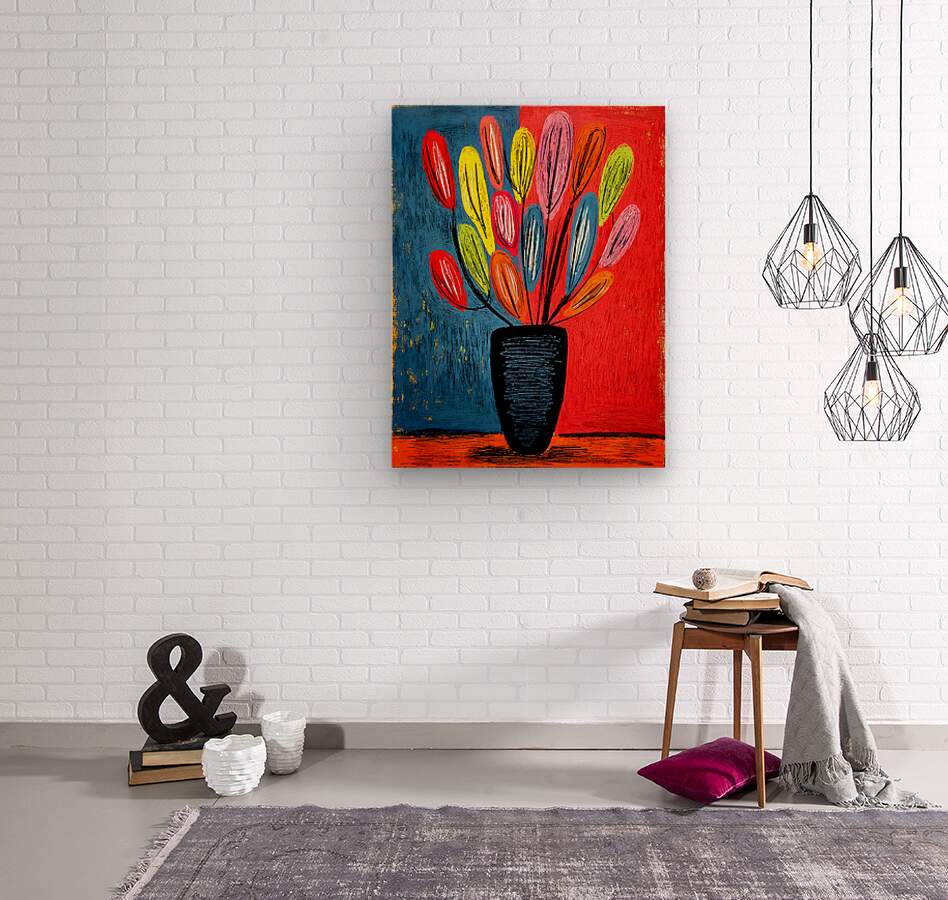 Dual Spectrum Blooms unites intensity and calm in a perfect visual balance. Against a divided red-and-blue backdrop, bold petals in shades of yellow, orange, pink, and teal radiate from a dark vase — merging raw texture with refined color control. The composition feels both hand-crafted and modernist, bridging expressive brushwork with mid-century design rhythm. Ideal for living spaces, offices, or art lovers drawn to structure with soul. Available in canvas for tactile depth, HD metal for luminous detail, acrylic for sleek brilliance, or framed fine-art paper for timeless sophistication. Curated by Savage Art Prints.
