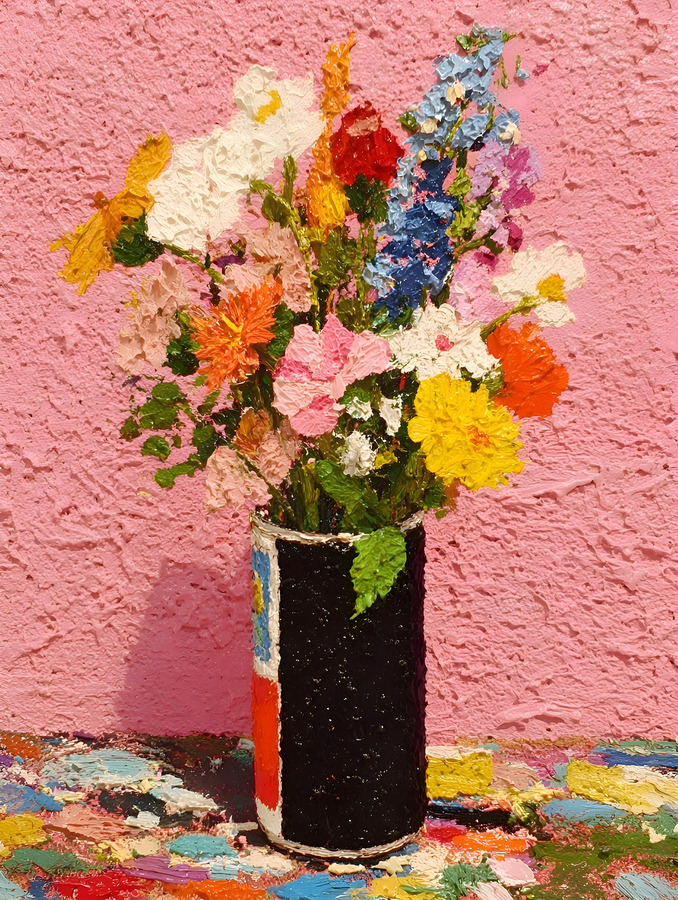 Pink Noise radiates tactile energy and painterly emotion. A wild bouquet of flowers bursts from a modern black-and-color-block vase, standing against ...[+]