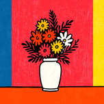 Color Field Blooms celebrates simplicity and joy through strong geometry and vivid hues. A white vase of stylized flowers stands before a split field ...[+]