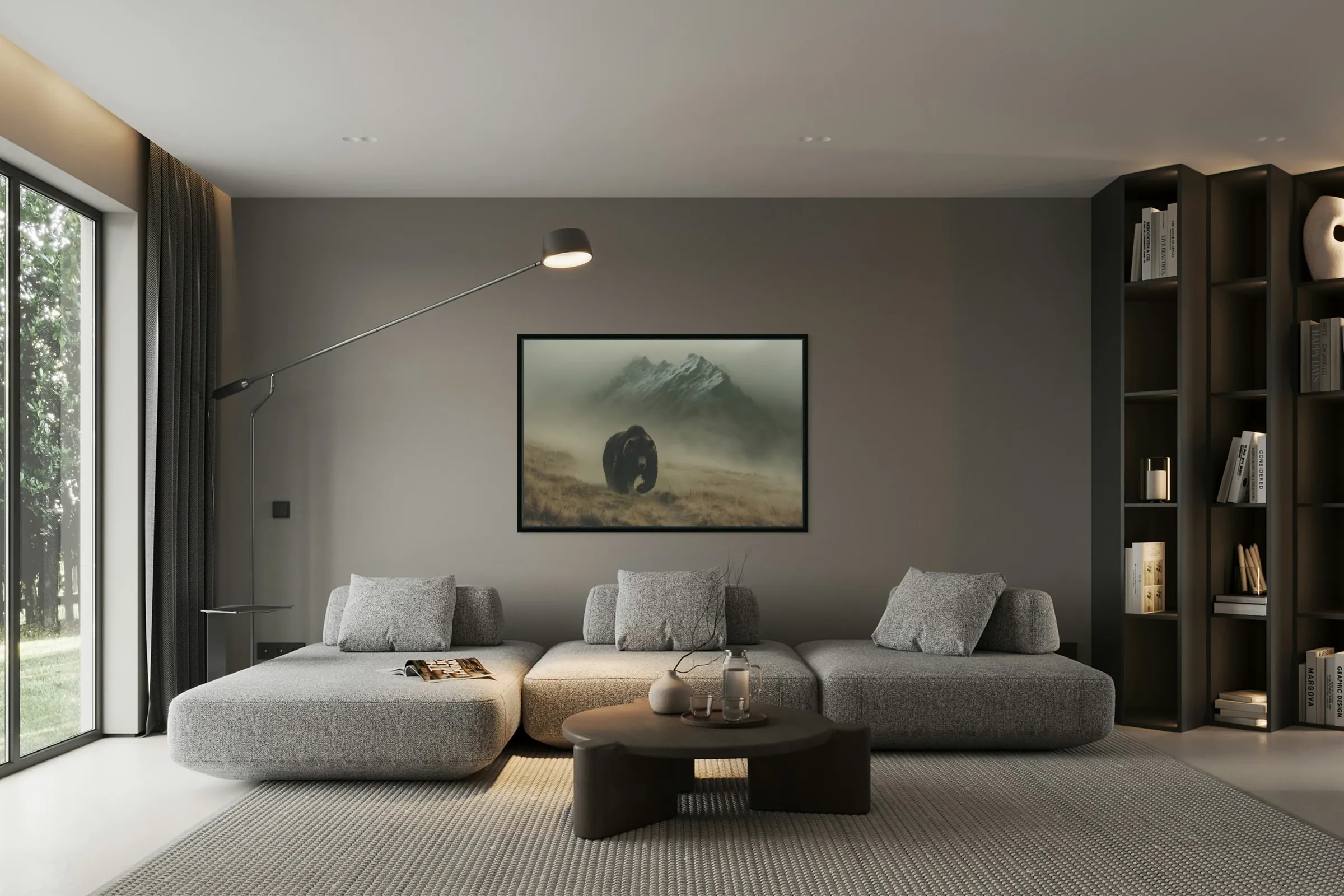 Spirit of the North – Grizzly in the Mist Print captures the awe of raw wilderness. A powerful grizzly bear strides through a mountain fog, embodying solitude, resilience, and primal grace. This cinematic wildlife scene brings an elemental connection to nature, ideal for rustic homes, modern lodges, and adventurous spirits. Curated by Savage Art Prints