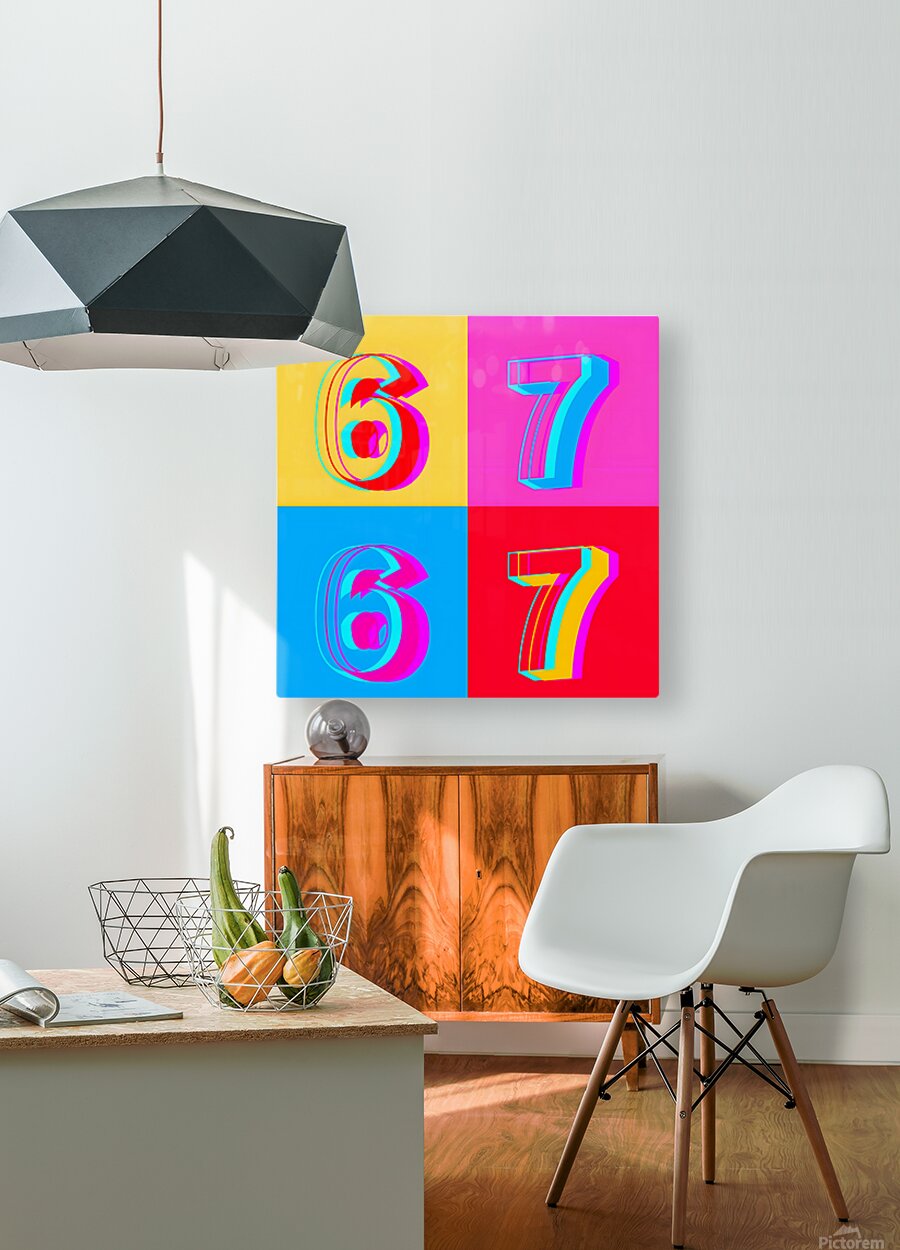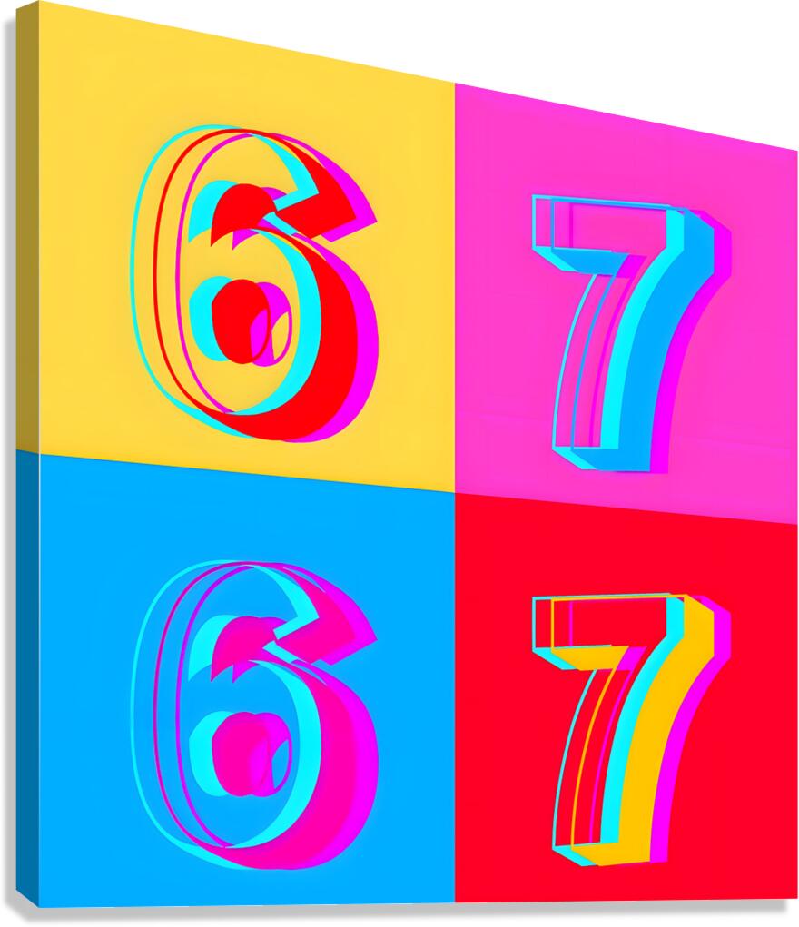 “ SIX SEVEN – GEN ALPHA POP ART EDITION” captures the chaos of the 6-7 meme: a loud, pointless, totally perfect number that Gen Alpha turned into its own secret handshake. The phrase exploded from Skrilla’s track Doot Doot (6 7) and highlight edits of 6'7" hoopers, then mutated into kids randomly yelling “six seven!” in classrooms, gyms, and TikTok clips for no reason other than it feels good to say. This artwork locks that energy into four bold quadrants—hot neon 6s and 7s vibrating like a glitchy scoreboard or a brainrot title card. No fixed meaning, just pure inside-joke energy: half basketball culture, half meme chaos, all attitude. It’s the perfect piece for a game room, teen bedroom, media wall, or anyone who lives online enough to roll their eyes and smile at the same time. In a world where everything has to “mean” something, this one proudly doesn’t. It just shouts SIX SEVEN from your wall and dares everyone else to keep up.