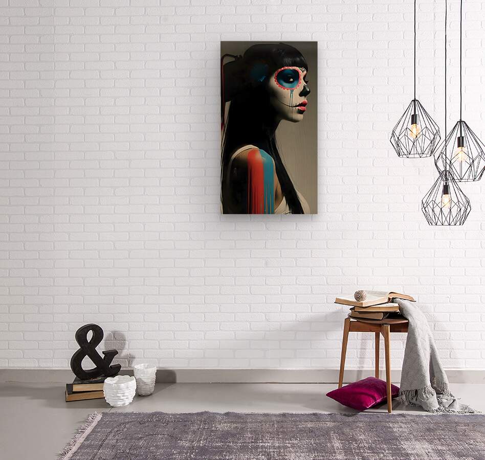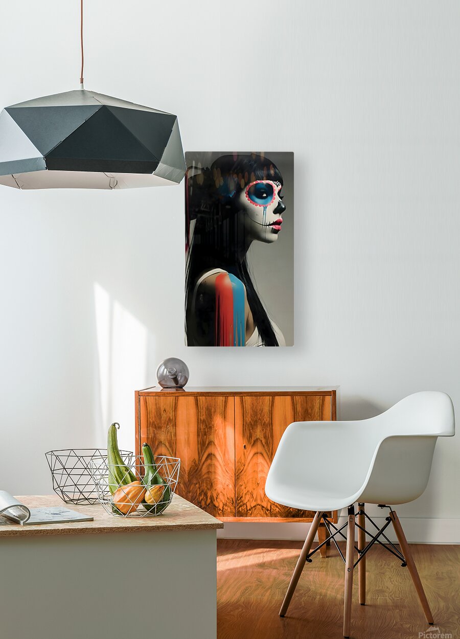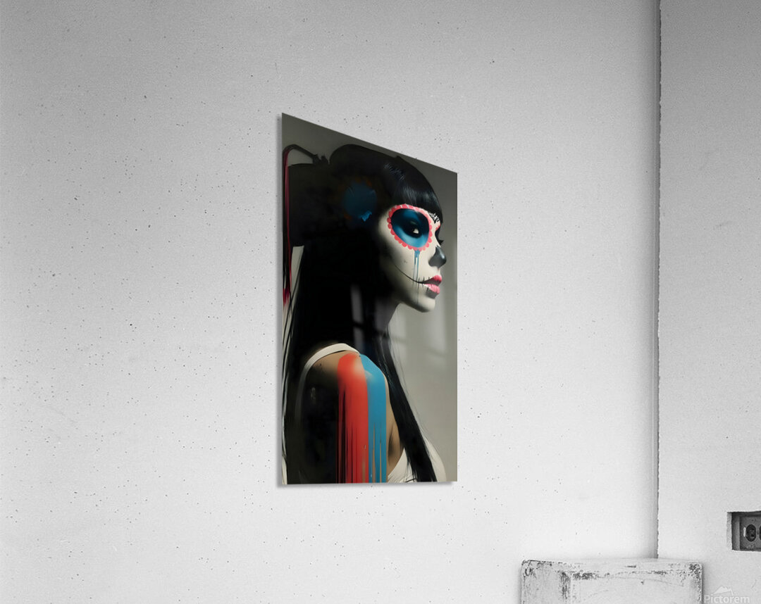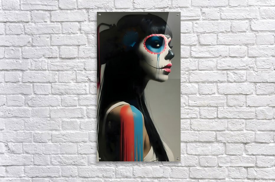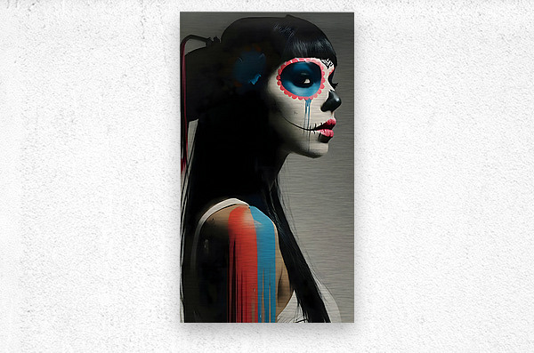 LÁGRIMAS AZULES – Blue Tears print strips Dia de los Muertos down to quiet essentials. Against a muted grey field, a poised profile wears sugar-skull makeup with a single band of deep blue that drips like tears. A sweep of red and blue paint down her shoulder adds just enough chaos to keep the piece modern, stylish, and emotionally loaded. Printed as a giclée canvas print, premium acrylic print, smooth white or brushed aluminum, high-definition sublimatable metal, peel-and-stick mural, framed wall art, fine art paper print, wood print, panel piece, or puzzle print, this design is perfect for collectors who like their skull art subtle but unforgettable. Curated by Savage Art Prints.