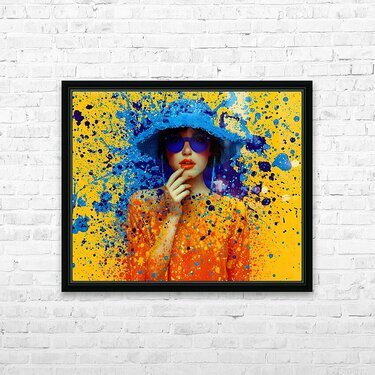 Vivid Rebellion – Color Splash Portrait Print explodes with electric blue and neon yellow paint splatters framing a confident woman in oversized sun...[+]