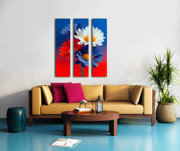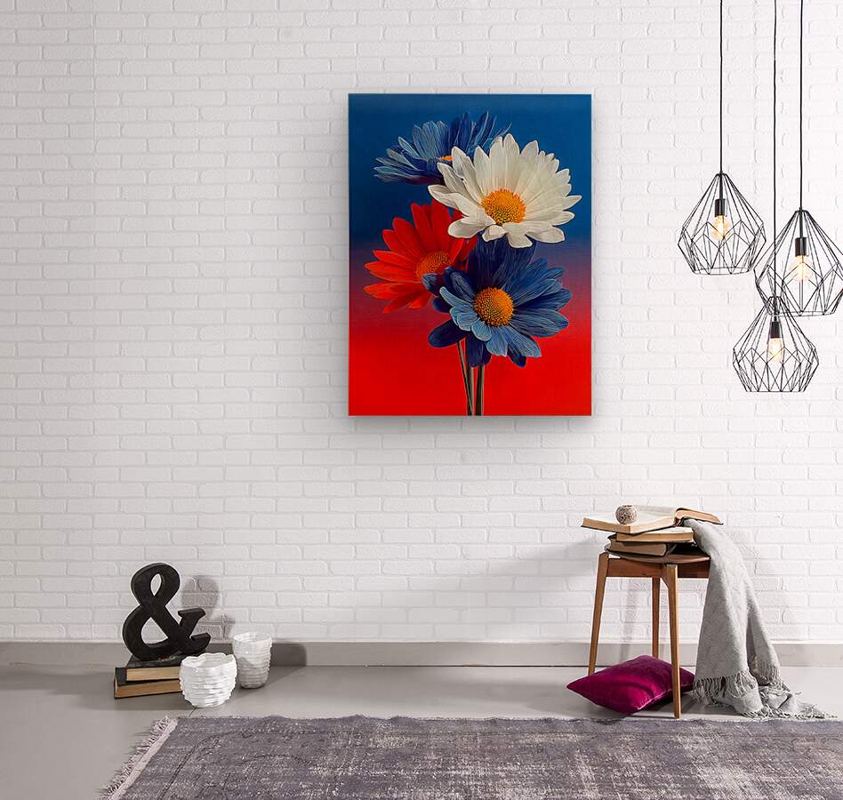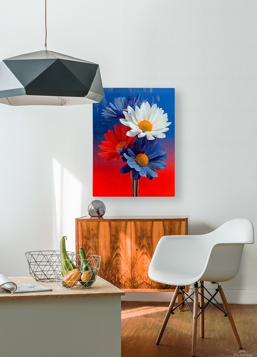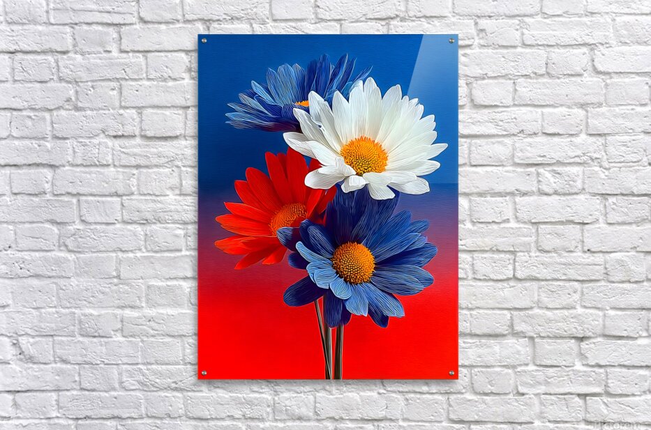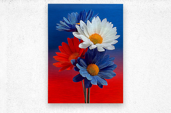 Patriotic Daisies – Red White Blue Floral Print bursts with oversized daisies in brilliant red, crisp white, and deep blue against a split-color backdrop—pure Americana energy that instantly livens kitchens, entryways, or patriotic spaces. This artwork is available as a giclée canvas print for rich color and painterly depth, a premium acrylic print for a sleek, gallery-style sheen, and smooth white metal or brushed aluminum pieces for a contemporary edge. You can also choose high-definition sublimatable metal, peel-and-stick murals, framed options, fine art paper, warm wood prints, multi-panel layouts, or puzzle prints. Curated by Savage Art Prints.