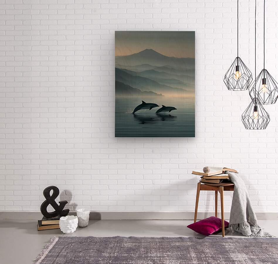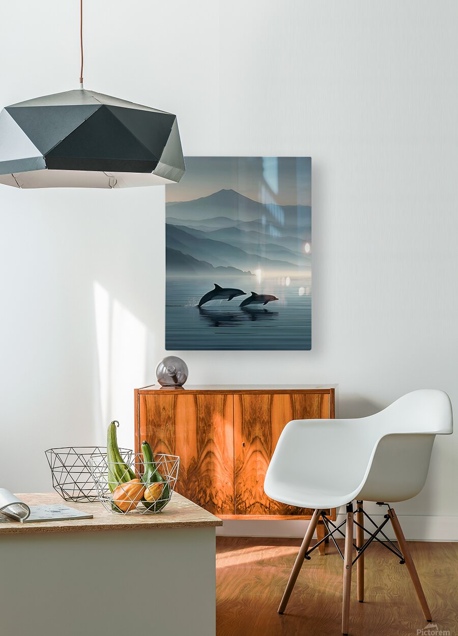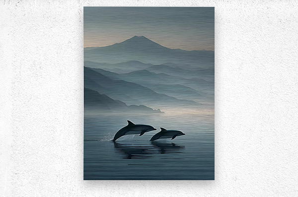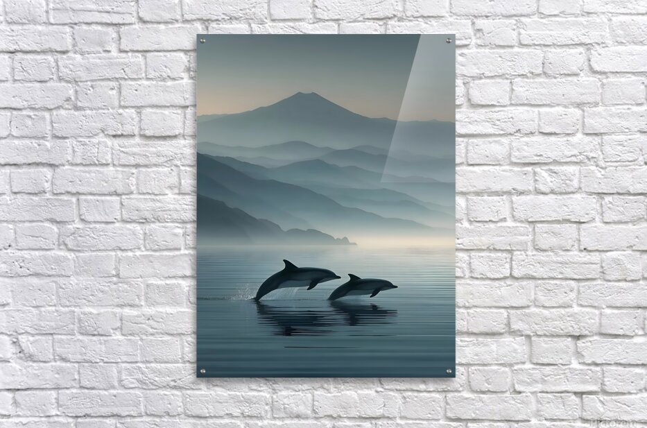 Misty Dolphins – Serene Ocean Leap Print captures two dolphins gracefully leaping through soft morning fog over tranquil waters, framed by distant mountains—pure zen for coastal homes, spas, or any space craving calm. This artwork is available as a giclée canvas print for rich color and painterly depth, a premium acrylic print for a sleek, gallery-style sheen, and smooth white metal or brushed aluminum pieces for a contemporary edge. You can also choose high-definition sublimatable metal, peel-and-stick murals, framed options, fine art paper, warm wood prints, multi-panel layouts, or puzzle prints. Curated by Savage Art Prints.