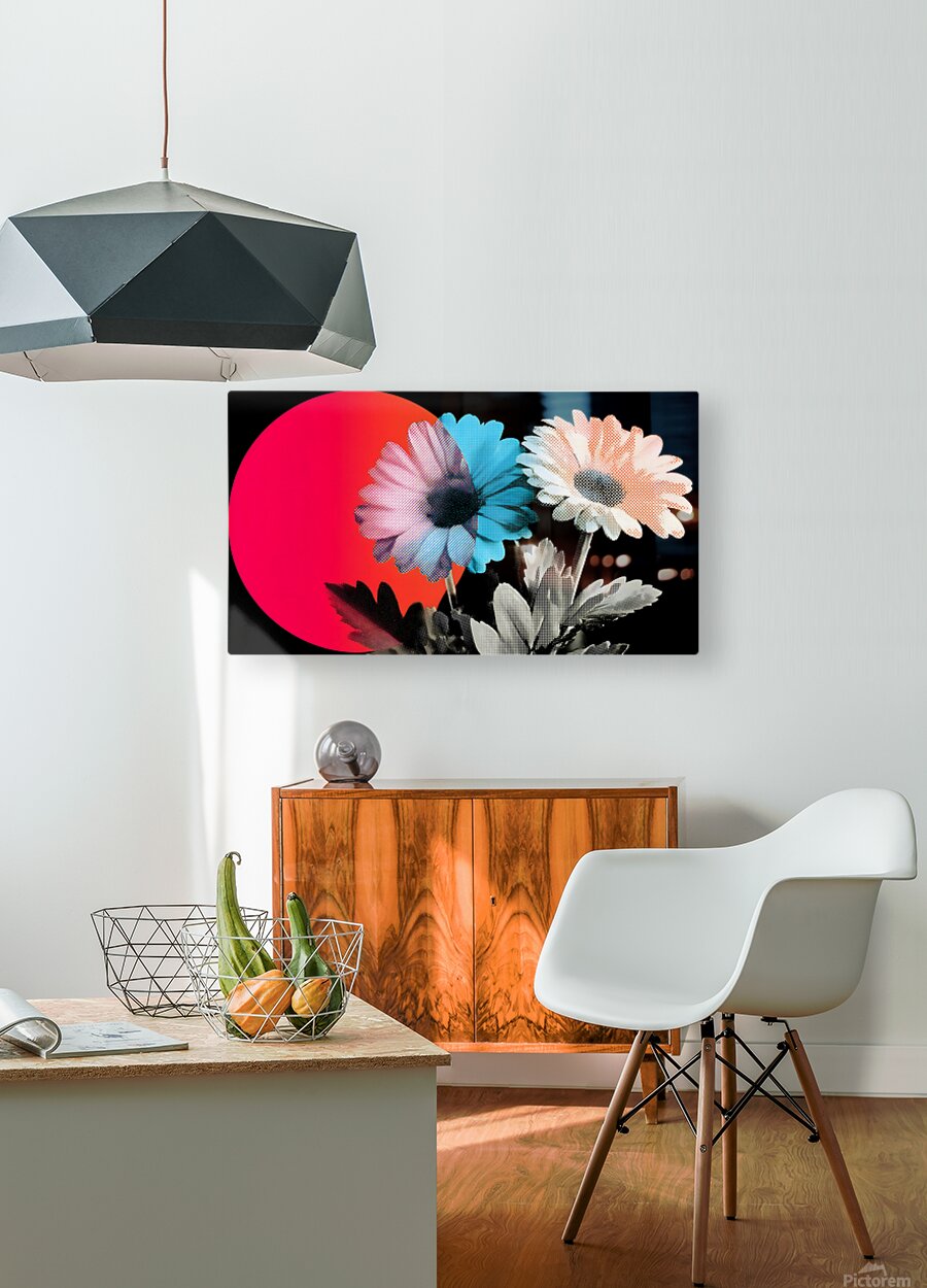 Neon Bloom Eclipse – Retro Daisy Pop Art Print pairs two glowing daisies—one electric blue, one soft peach—against a massive hot-red sun on black, delivering pure 80s synth-wave flower power. This eye-popping piece brings instant retro-cool energy to bedrooms, studios, or any space that loves bold, playful nostalgia. This artwork is available as a giclée canvas print for rich color and painterly depth, a premium acrylic print for a sleek, gallery-style sheen, and smooth white metal or brushed aluminum pieces for a contemporary edge. You can also choose high-definition sublimatable metal, peel-and-stick murals, framed options, fine art paper, warm wood prints, multi-panel layouts, or puzzle prints. Curated by Savage Art Prints.