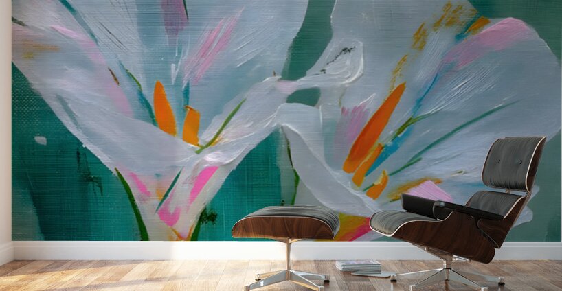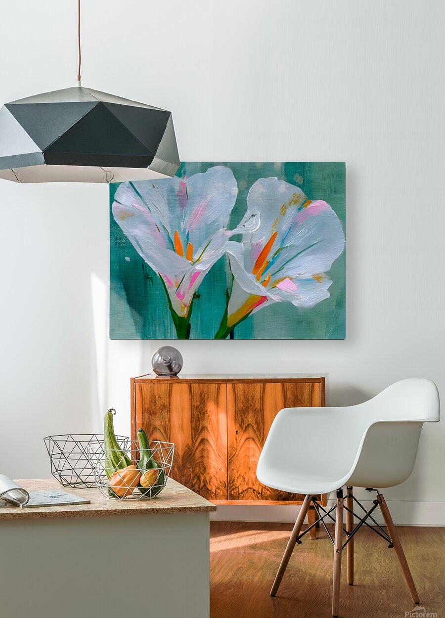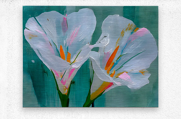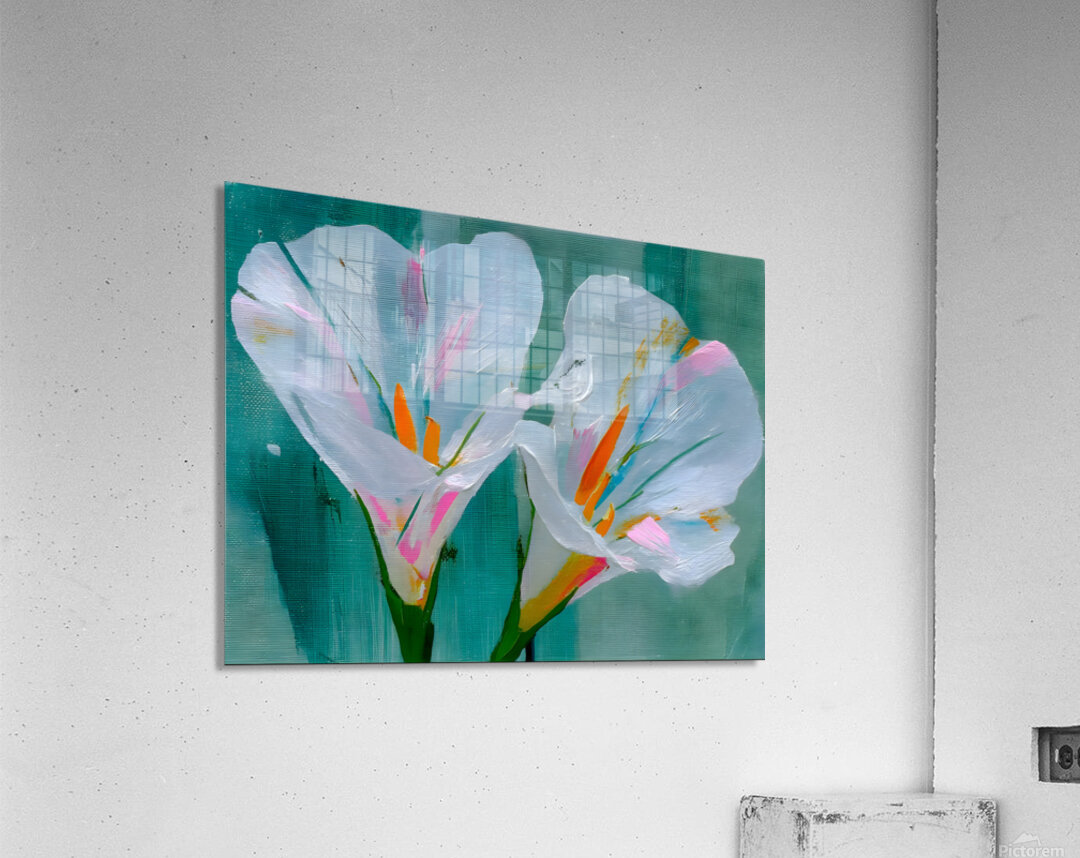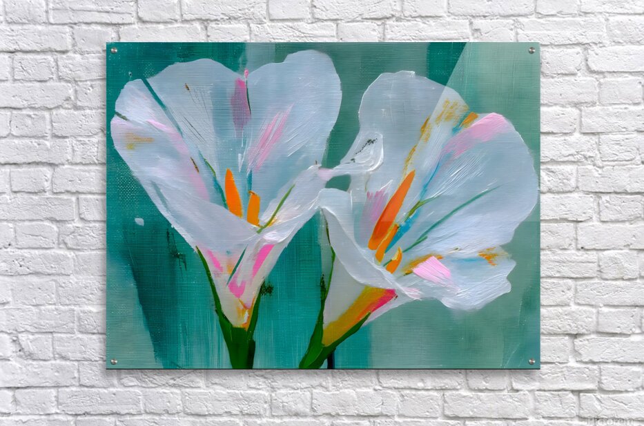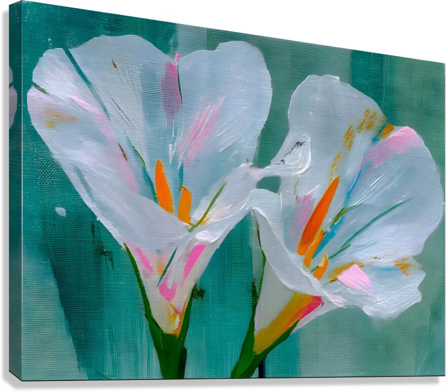 Minimalist White Iris Flower Art Print presents two luminous white irises blooming against a moody teal and charcoal backdrop, their delicate petals softly textured and glowing with quiet elegance. This serene, modern botanical piece brings calm sophistication to any space—perfect for minimalist interiors, spa-like bathrooms, tranquil bedrooms, or contemporary living rooms craving understated luxury. The subtle contrast and painterly brushwork make it a timeless focal point that feels both fresh and classic. Available as museum-quality giclée canvas prints for rich texture and depth, premium acrylic prints for brilliant clarity and modern sheen, white or brushed metal prints for sleek contemporary edge, high-definition sublimatable metal, peel-and-stick murals, ready-to-hang framed wall art, fine art paper prints, warm wood prints, multi-panel layouts, or interactive puzzle prints. Curated by Savage Art Prints.