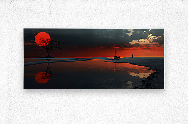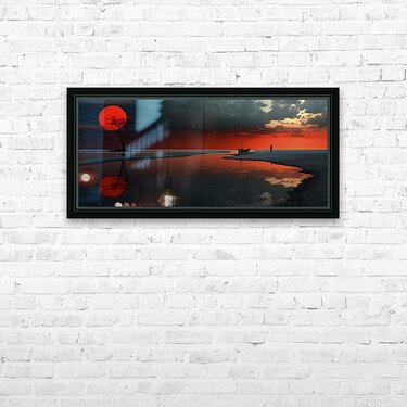 “Scarlet Sun Lake” distills evening calm into simple shapes: a red sun, glassy water, and quiet silhouettes. The minimalist composition creates in...[+]