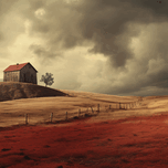 A weathered barn crowns rolling golden hills while thunderheads press low over a ribbon of fence. In the foreground, a crimson field glows like embers...[+]
