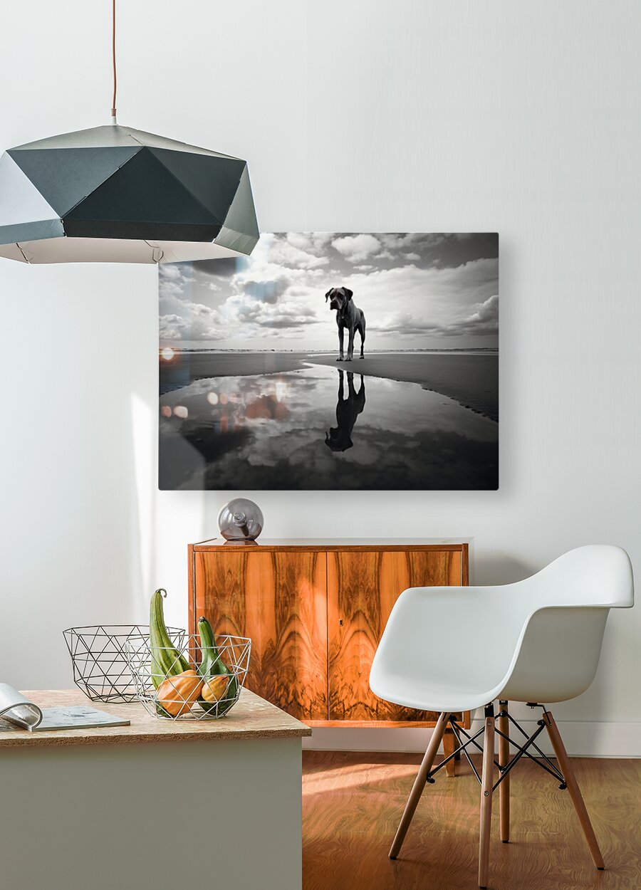 A lone dog stands on an empty shoreline, mirrored perfectly in a tidepool beneath brooding clouds. The crisp monochrome tones give “Lost in My Eyes” a cinematic quiet—equal parts strength and tenderness—making it a standout for modern spaces. Let it anchor a living room gallery wall, bring contemplative calm to a bedroom, or add character to a coastal-inspired office or entryway. Choose canvas for a soft, matte gallery feel; HD metal for razor-sharp detail and luminous contrast; acrylic for glass-like depth and a sleek, contemporary edge; or framed fine-art paper for a refined, low-glare presentation. Printed with archival inks on premium substrates and available in custom sizes for a polished, ready-to-hang finish. Curated by Savage Art Prints.
