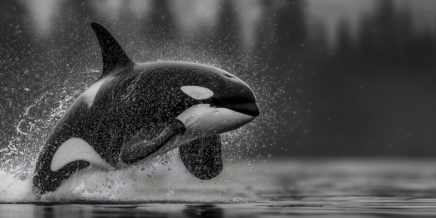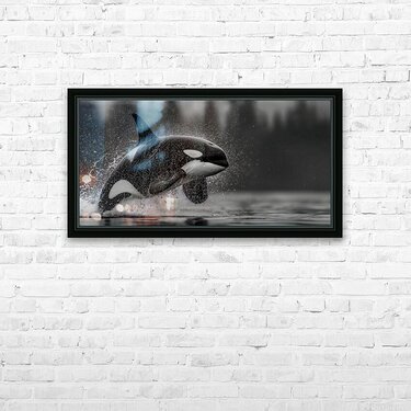 A powerful orca explodes from the water, frozen mid-breach as spray hangs like stars. “Ambush” brings athletic grace and ocean drama to modern spa...[+]