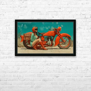 A classic cycling scene in warm oranges and teal blues delivers retro travel energy with clean poster geometry. The composition feels fast but orderly...[+]