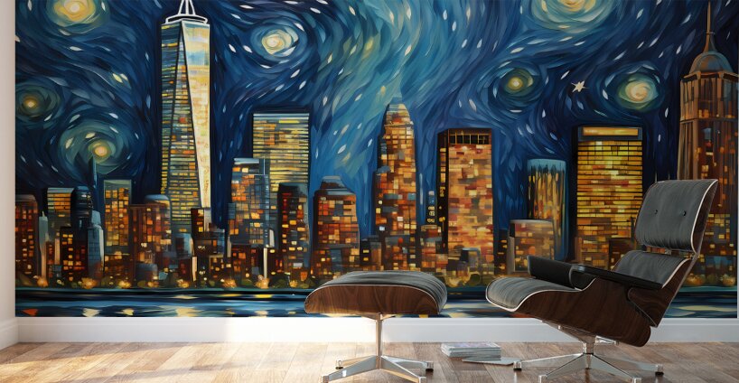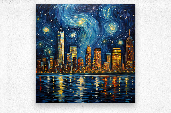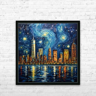 “Starry Night Skyline” is a luminous fusion of Van Gogh's swirling celestial vision and the iconic cityscape of New York. This captivating pie...[+]