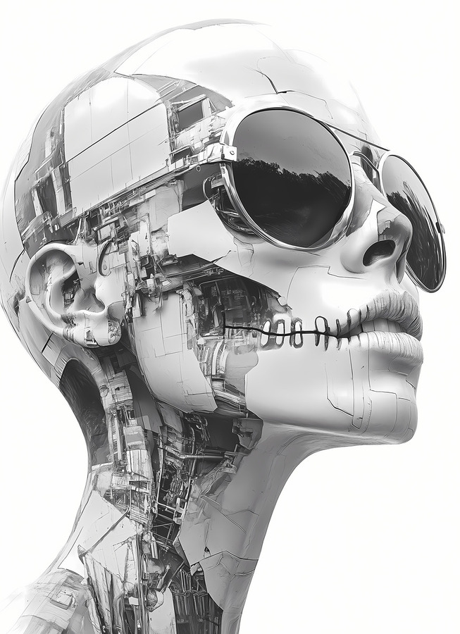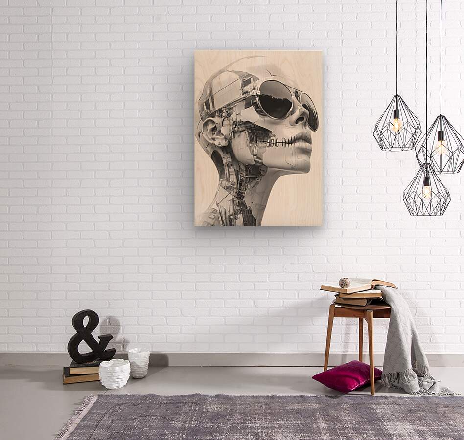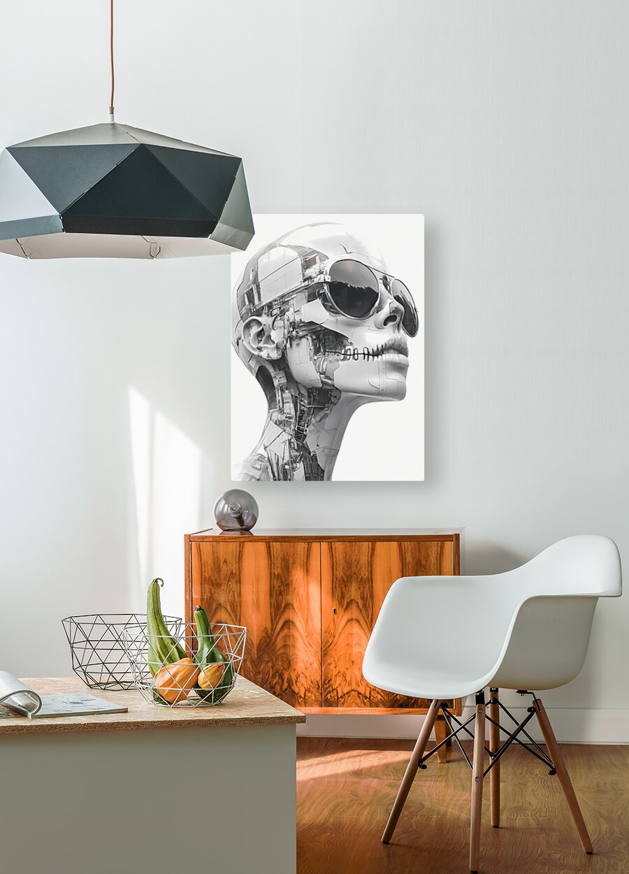 “Echoes of Escher” is a hauntingly beautiful homage to the legendary mind of M.C. Escher—reinterpreted through the cold elegance of artificial intelligence. This grayscale biomechanical portrait features a silent, machine-stitched humanoid form adorned with reflective aviator sunglasses, its skin composed of fractured architectural elements and embedded circuitry. With its lips sewn shut and expression unreadable, the figure becomes both sculpture and cipher—a being of perfect form, yet enigmatic purpose. Geometry meets ghost, code meets consciousness. The tension between symmetry and chaos, flesh and machine, echoes Escher’s fascination with paradox and illusion. It’s a visual riddle wrapped in chrome. Ideal for lovers of surrealist geometry, cyberpunk philosophy, posthuman beauty, and the mesmerizing language of design made eternal. “Echoes of Escher” blends pop culture edge with gallery-clean minimalism, perfect for studios, lofts, and modern offices. Strong contrast reads from distance; close inspection reveals intricate structure. Choose canvas for matte presence; HD metal for mirror-gloss precision; acrylic for glass-clear depth; or framed fine-art paper for a refined, low-glare finish. Printed with archival inks on premium materials in custom sizes, ready to hang or frame. Curated by Savage Art Prints.