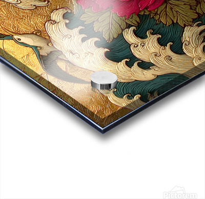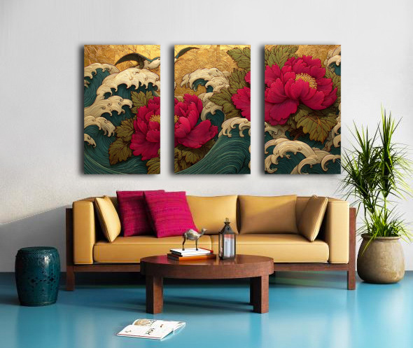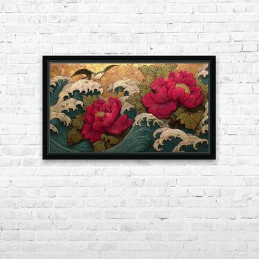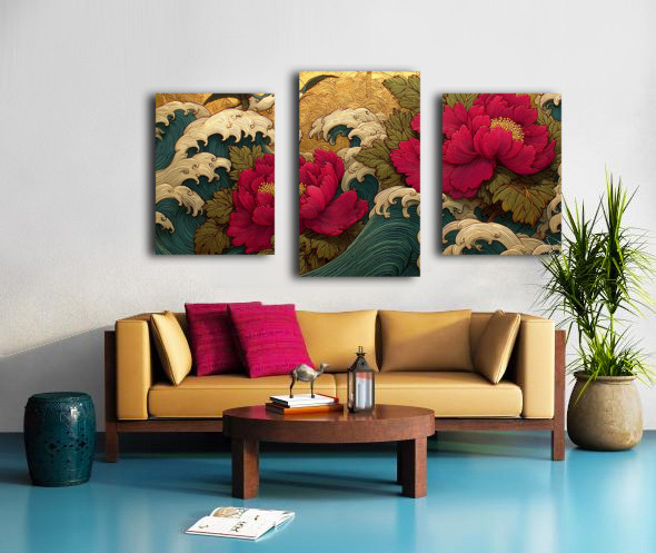 japanese floral art, waves and flowers art, sakura and sea print, asian botanical decor, teal and red artwork, oriental wall art, romantic wall art, s