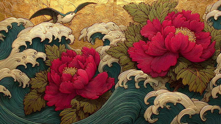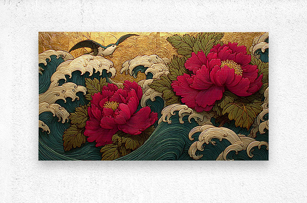 japanese floral art, waves and flowers art, sakura and sea print, asian botanical decor, teal and red artwork, oriental wall art, romantic wall art, s
