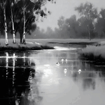 ABOUT THIS ARTWORK: BY THE RIVERBANK - MONOCHROME LANDSCAPE ART PRINTS