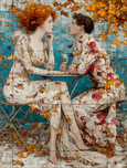 Russet leaves, soft teal shadows, and warm golds surround a poised figure, turning fall color into quiet romance. The brushwork keeps things tactile a...[+]