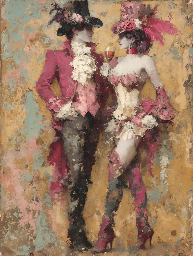 A romantic figure rendered in rose, coral, and champagne tones captures the quiet tension of longing. Painterly texture softens the silhouette while h...[+]