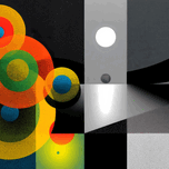 Vibrant circles stack and intersect with grayscale forms, creating a clean conversation between color and neutral. The composition feels playful yet o...[+]