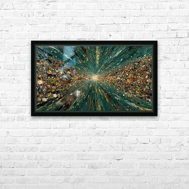 A river of light threads through a field of fine points, hinting at star trails and deep-space motion. The palette leans teal-green with dark neutrals and pinpoint highlights, reading calm from across the room and intricate up close. Strong above sofas and desks, it also centers bedrooms and entry walls where you want quiet drama. Available as canvas for warm matte depth, HD metal for glossy clarity and pinpoint detail, acrylic for glass-like sheen, and framed paper for a classic, low-glare presentation. Printed with archival inks on premium materials, offered in custom sizes to match your wall. Curated by Savage Art Prints.