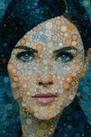 A striking female face emerges from hundreds of circular “tiles,” turning portraiture into a geometric study of tone and rhythm. Warm oranges, tea...[+]