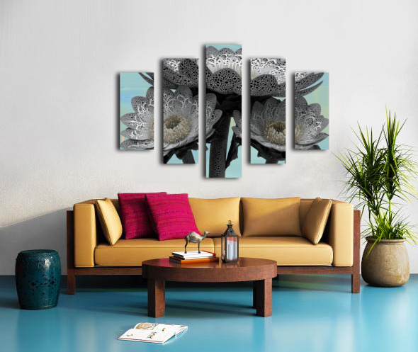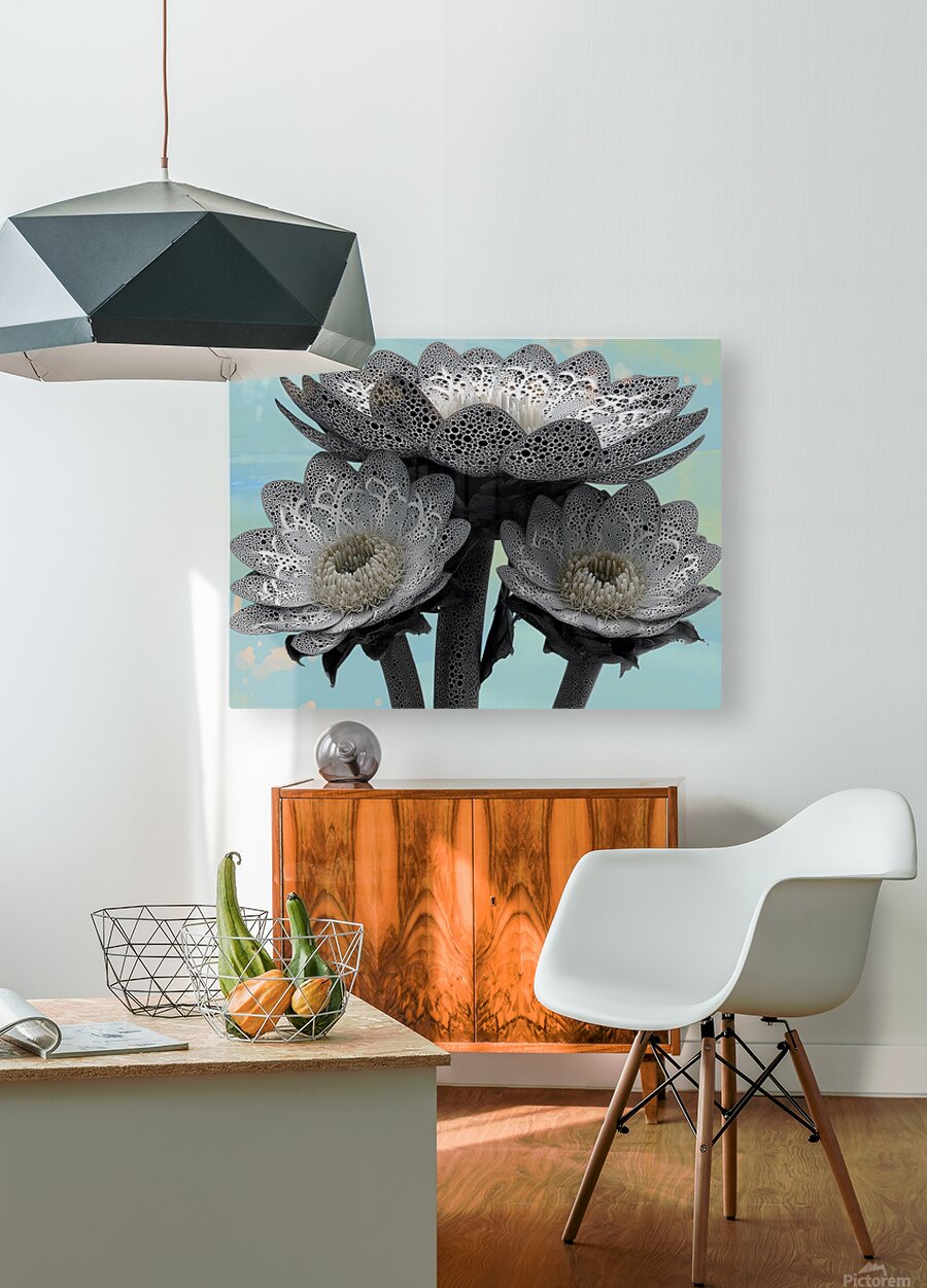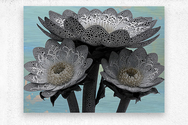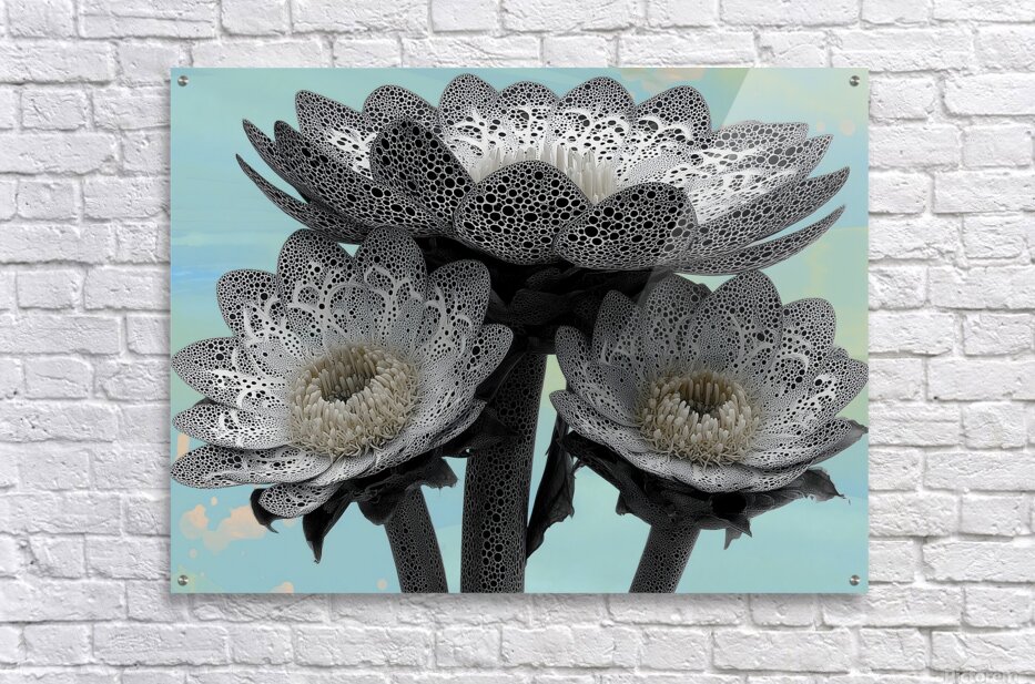 Three lotus blooms rise like lace—petals perforated with tiny orbs, stamens standing in porcelain whites. The airy aqua background keeps the piece light and meditative while the crisp monochrome petals add sculptural presence. A clean, modern focal point for spas, bedrooms, and calm living spaces. Choose canvas for matte tactility; HD metal for glossy snap and ultra-fine detail; acrylic for glass-clear depth and a floating effect; or framed fine-art paper for a refined, low-glare presentation. Printed with archival inks on premium materials in custom sizes, ready to hang or frame. Curated by Savage Art Prints.