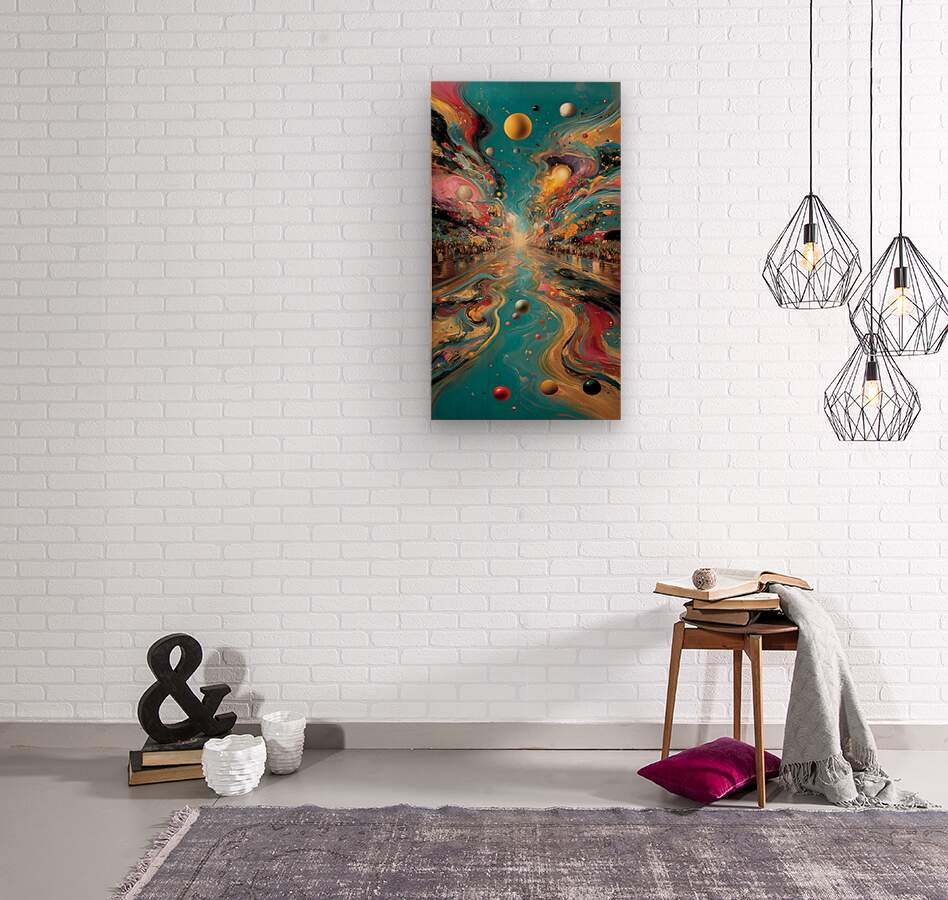A river of turquoise and molten gold flows to a glowing horizon while orbiting spheres drift overhead and crowds line a ceremonial way — part dreamscape, part celestial parade. Rich marbling and jeweled highlights lend cinema-scale drama to tall spaces like stairwells and entry halls. Print on acrylic for unbelievable depth and sparkle, choose HD metal for saturated color and sleek sheen, canvas for a soft painterly read, or framed fine-art paper for a classic gallery feel. Produced with archival inks on premium substrates and available in custom dimensions. Curated by Savage Art Prints.