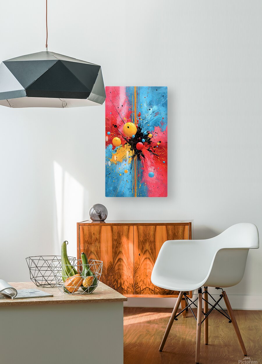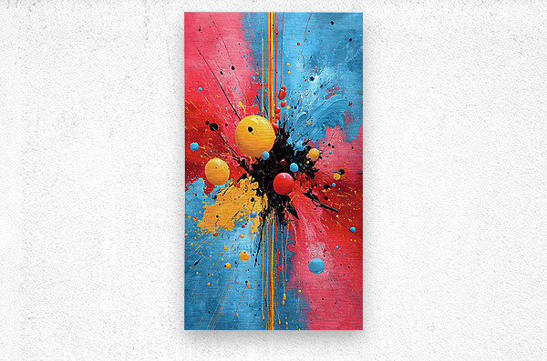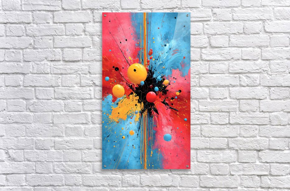 A vertical strike of sun-yellow cleaves a field of crimson and cerulean as the center detonates into glossy spheres and high-velocity splatters. The palette is unabashedly primary, the motion pure adrenaline — a bold conversation starter for creative offices, media rooms, or a daring hallway. Reproduce on HD metal for maximum punch and clean gloss, acrylic for immersive depth, canvas for velvety texture, or framed fine-art paper for a sophisticated gallery finish. Printed with archival pigments on premium substrates and available in custom sizes, ready to hang or frame. Curated by Savage Art Prints.