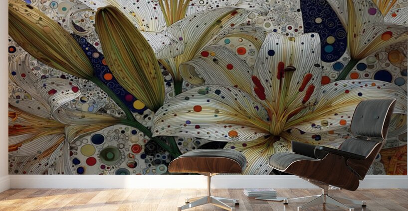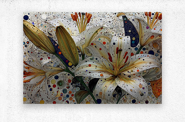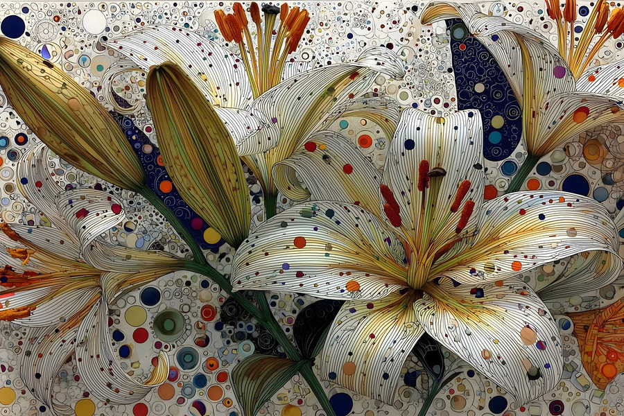 Delicate lilies unfurl in ivory and honey while fine ink lines trace each petal like topographic maps. Behind them, a constellation of tiny circles an...[+]