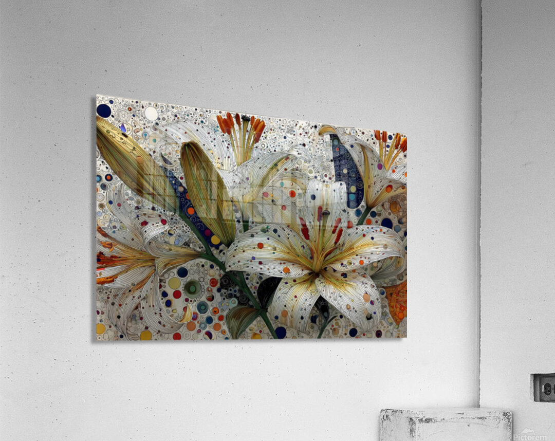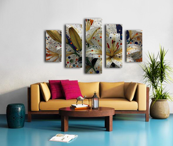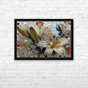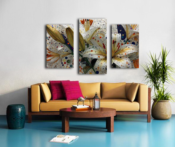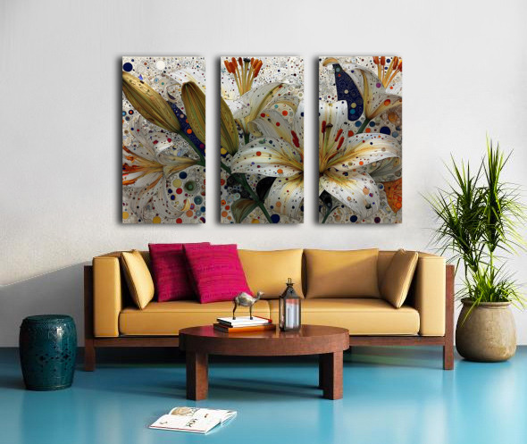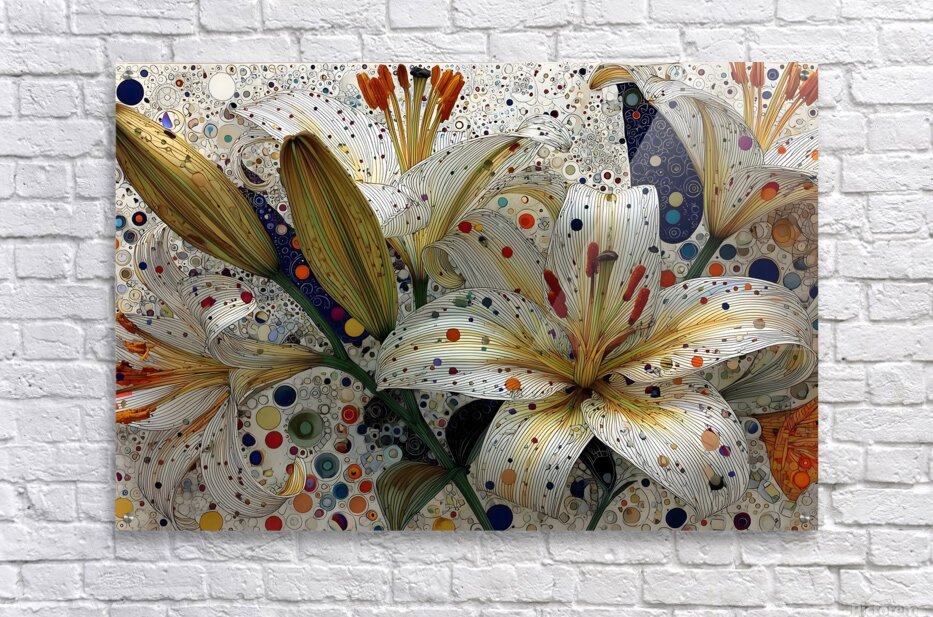 Delicate lilies unfurl in ivory and honey while fine ink lines trace each petal like topographic maps. Behind them, a constellation of tiny circles and color pops—saffron, indigo, and coral—adds playful modern rhythm. “Stargazer Constellation” feels both botanical and graphic, bringing calm luminosity to bedrooms, dining spaces, and airy entryways. Choose canvas for velvety matte depth; HD metal for luminous color and sleek gloss; acrylic for glass-clear dimension; or framed fine-art paper for a refined, low-glare presentation. Printed with archival inks on premium materials in custom sizes. Curated by Savage Art Prints.