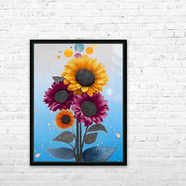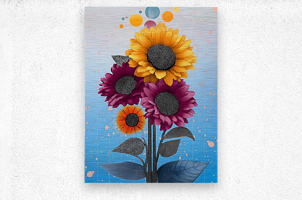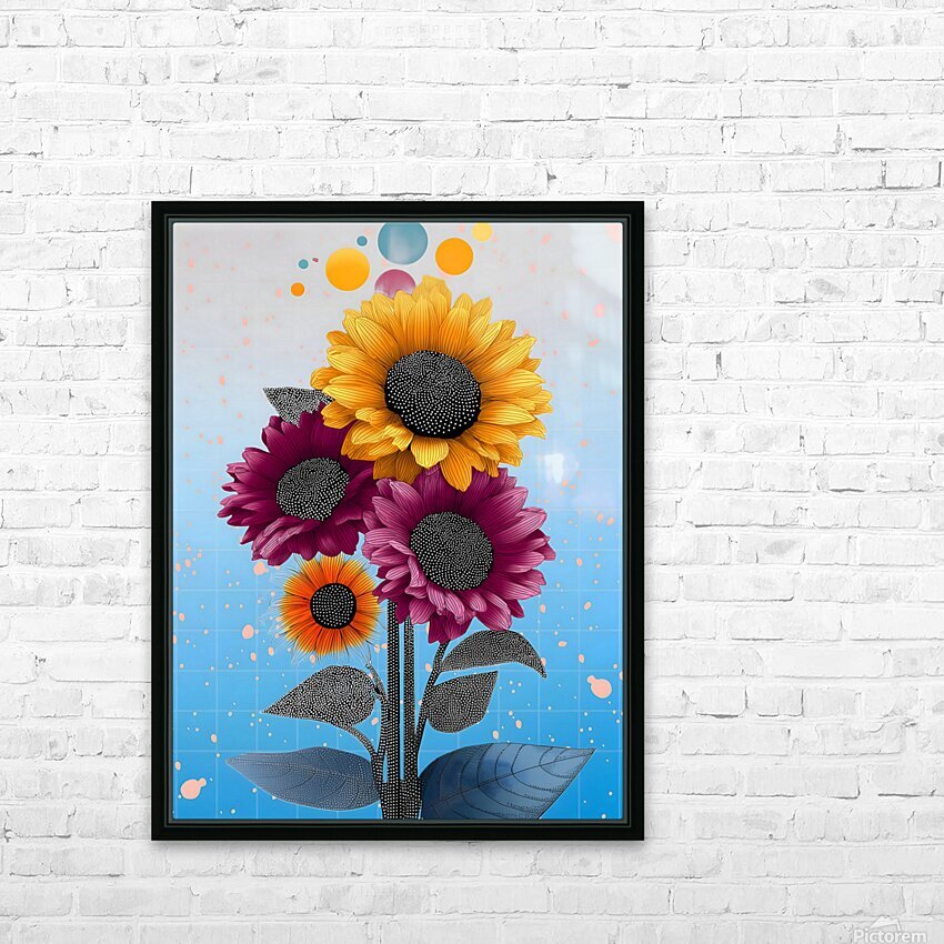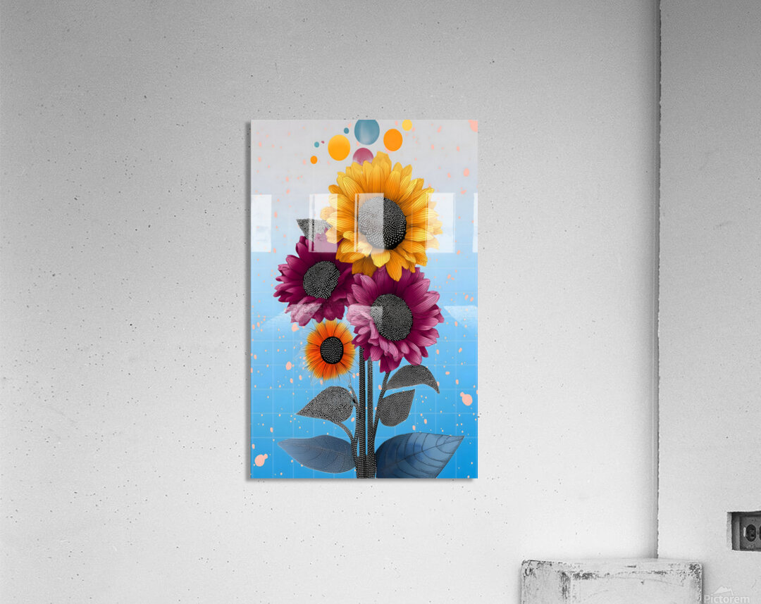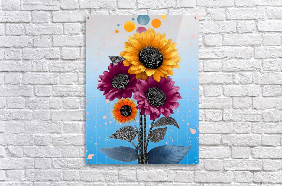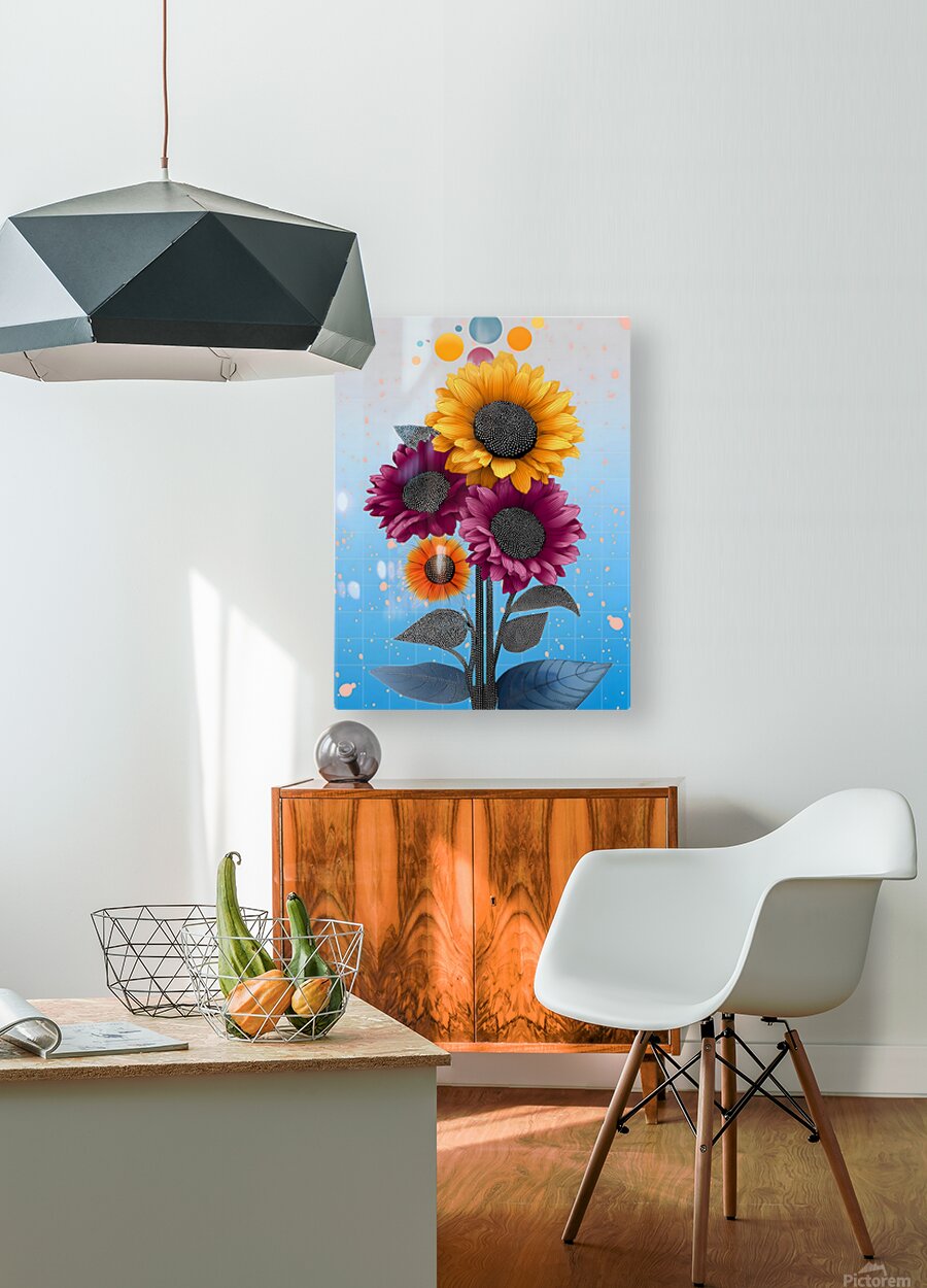 Sunlit ochres and berry reds meet in a graphic bouquet with inky, dotted centers and playful floating orbs. The gridded sky fades from cool blue to pearl, giving these sunflowers a crisp, upbeat vibe that energizes kitchens, studios, and entryways. Choose canvas for soft depth, HD metal for slick, high-gloss color, acrylic for a glass-like pop, or framed fine-art paper for refined texture. Museum-grade inks and customizable sizes ensure long-lasting, gallery-quality impact. Curated by Savage Art Prints.