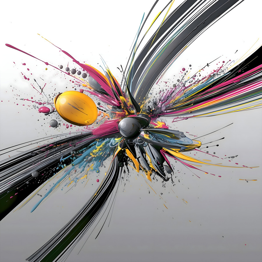 Arcing lines and bright droplets shoot across a soft field, freezing a split-second of motion. “Vector Bloom” feels like color in flight—energet...[+]