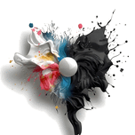 A glossy white orb anchors a collision of opposites—inky black and porcelain white—while ribbons of cyan, gold, and coral explode outward in high-...[+]