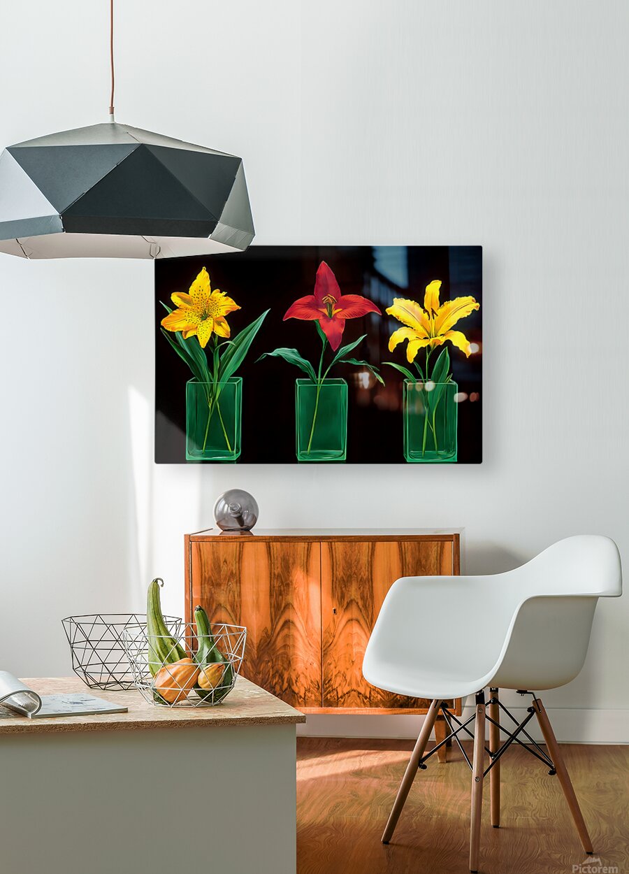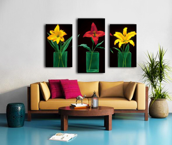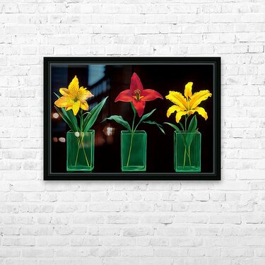 “Neon Stems” showcases three luminous lilies—yellow, red, and gold—glowing from emerald glass vases against a deep black field. The contrast is dramatic and elegant, perfect for dining rooms, kitchens, home bars, or modern hallways. From afar, the colors read like neon; up close, subtle gradients and reflections reveal painterly detail. Print on canvas for a rich matte finish, HD metal for high-gloss intensity, acrylic for glass-clear dimensionality, or framed fine-art paper for a refined, low-glare presentation. Archival inks, premium substrates, custom sizes. Curated by Savage Art Prints.