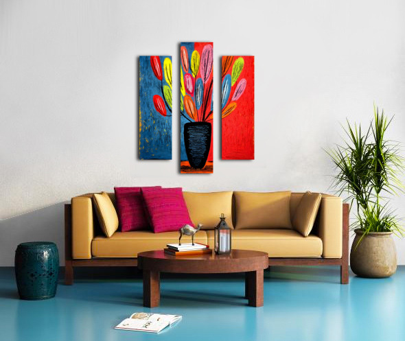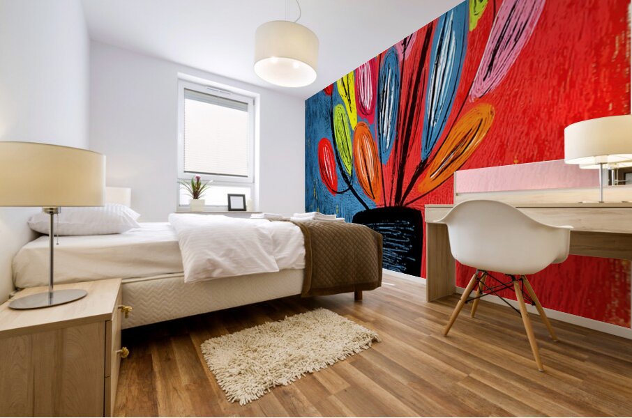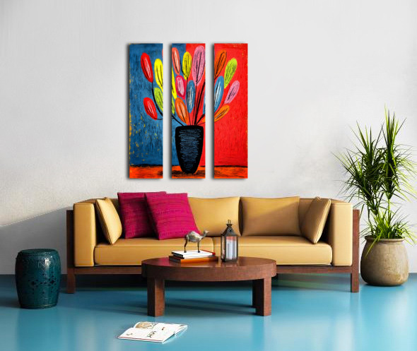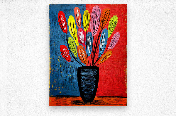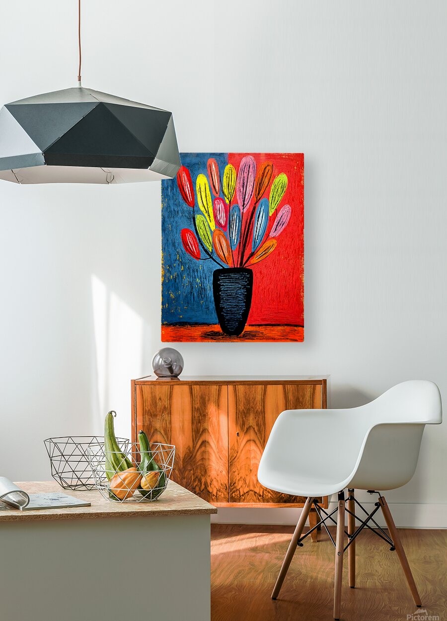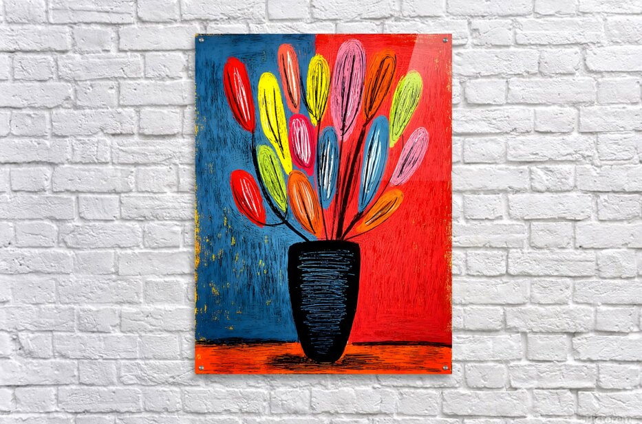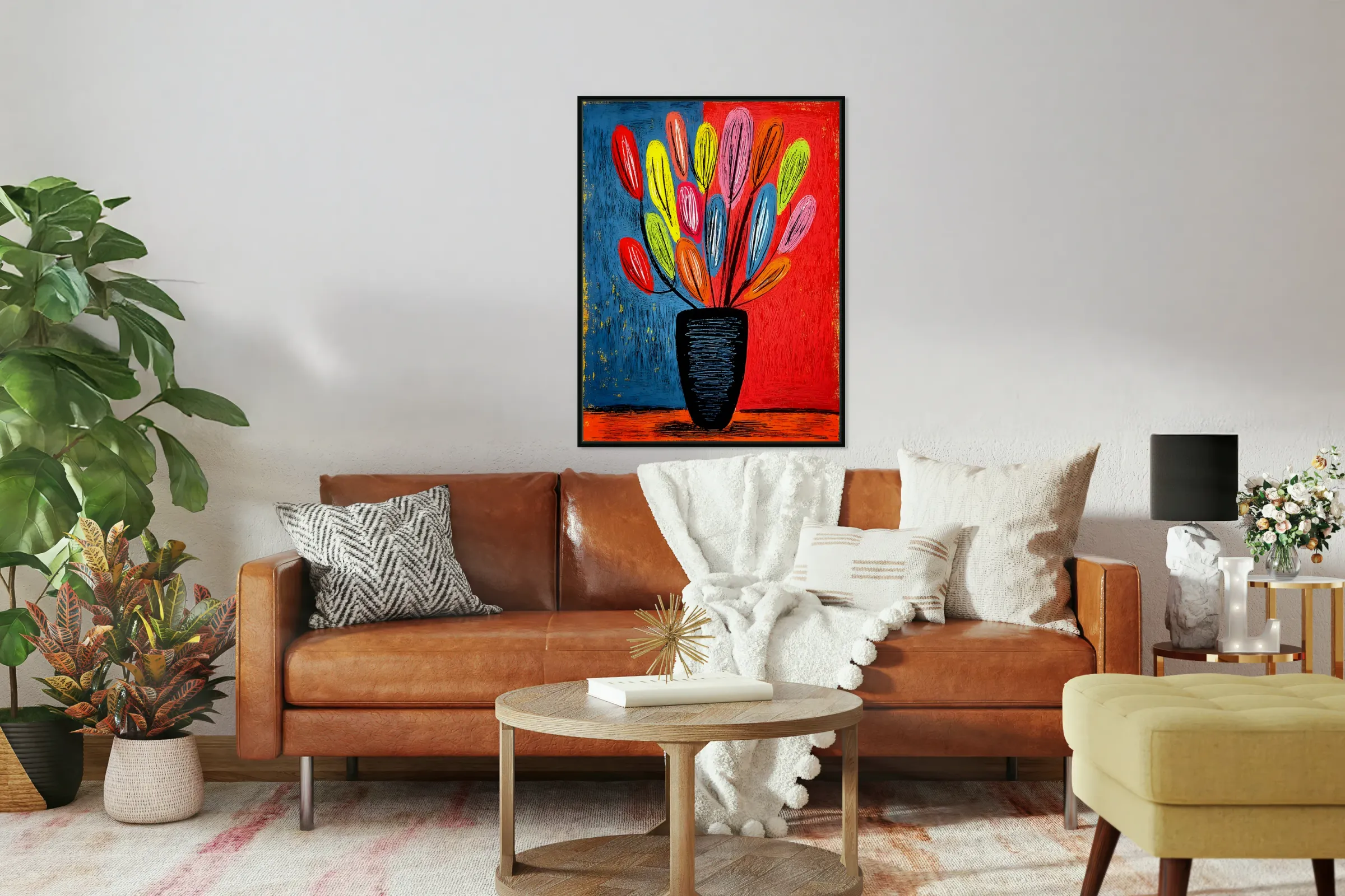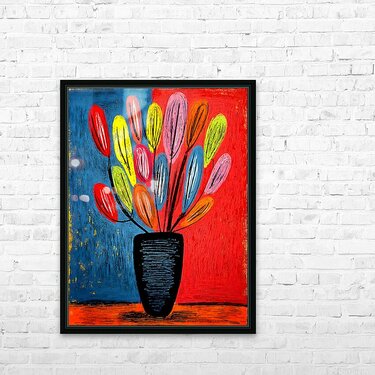 Dual Spectrum Blooms unites intensity and calm in a perfect visual balance. Against a divided red-and-blue backdrop, bold petals in shades of yellow, orange, pink, and teal radiate from a dark vase — merging raw texture with refined color control. The composition feels both hand-crafted and modernist, bridging expressive brushwork with mid-century design rhythm. Ideal for living spaces, offices, or art lovers drawn to structure with soul. Available in canvas for tactile depth, HD metal for luminous detail, acrylic for sleek brilliance, or framed fine-art paper for timeless sophistication. Curated by Savage Art Prints.